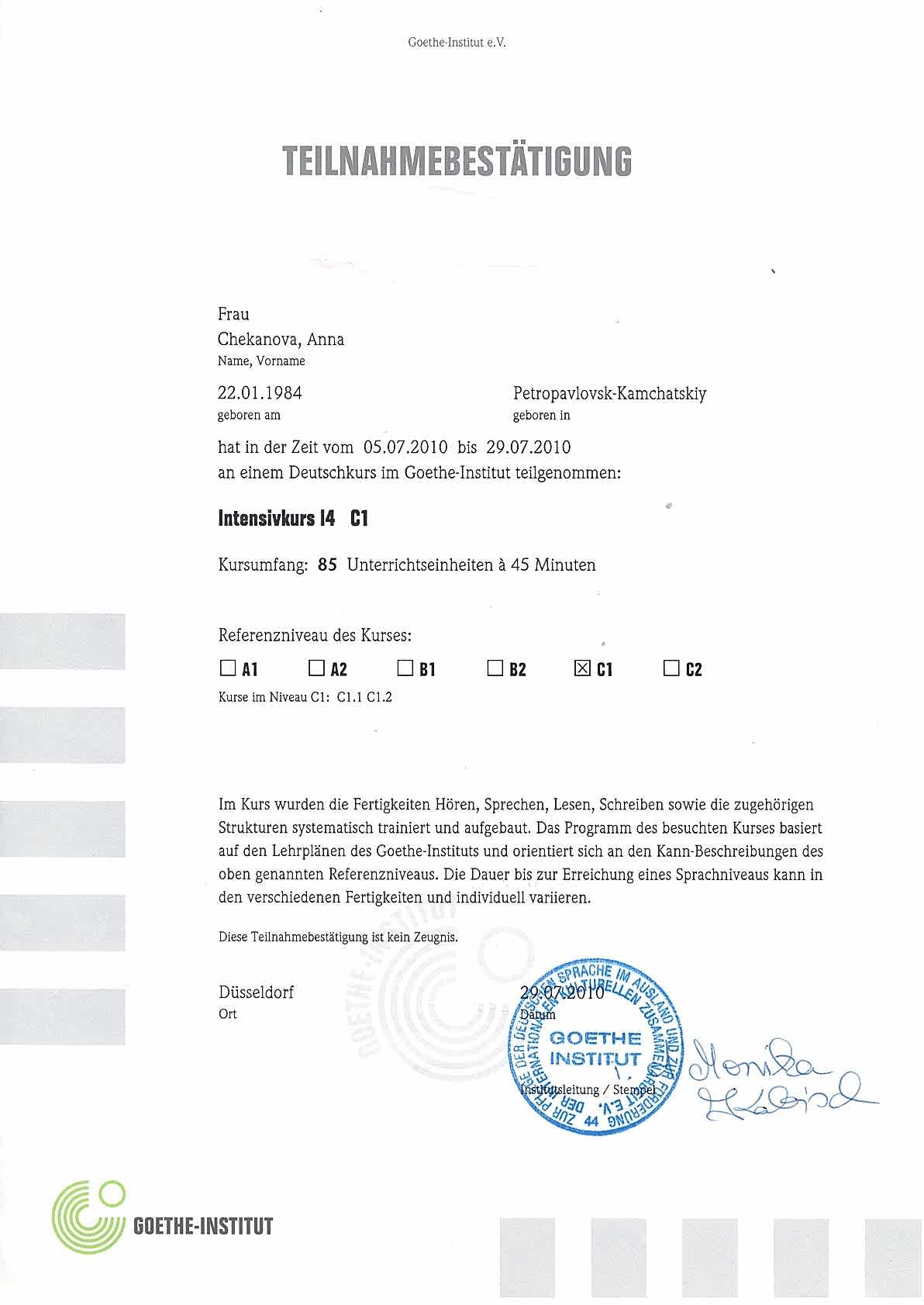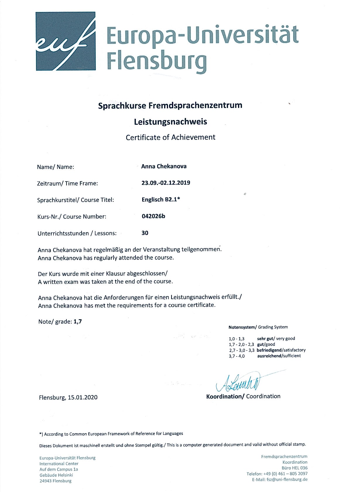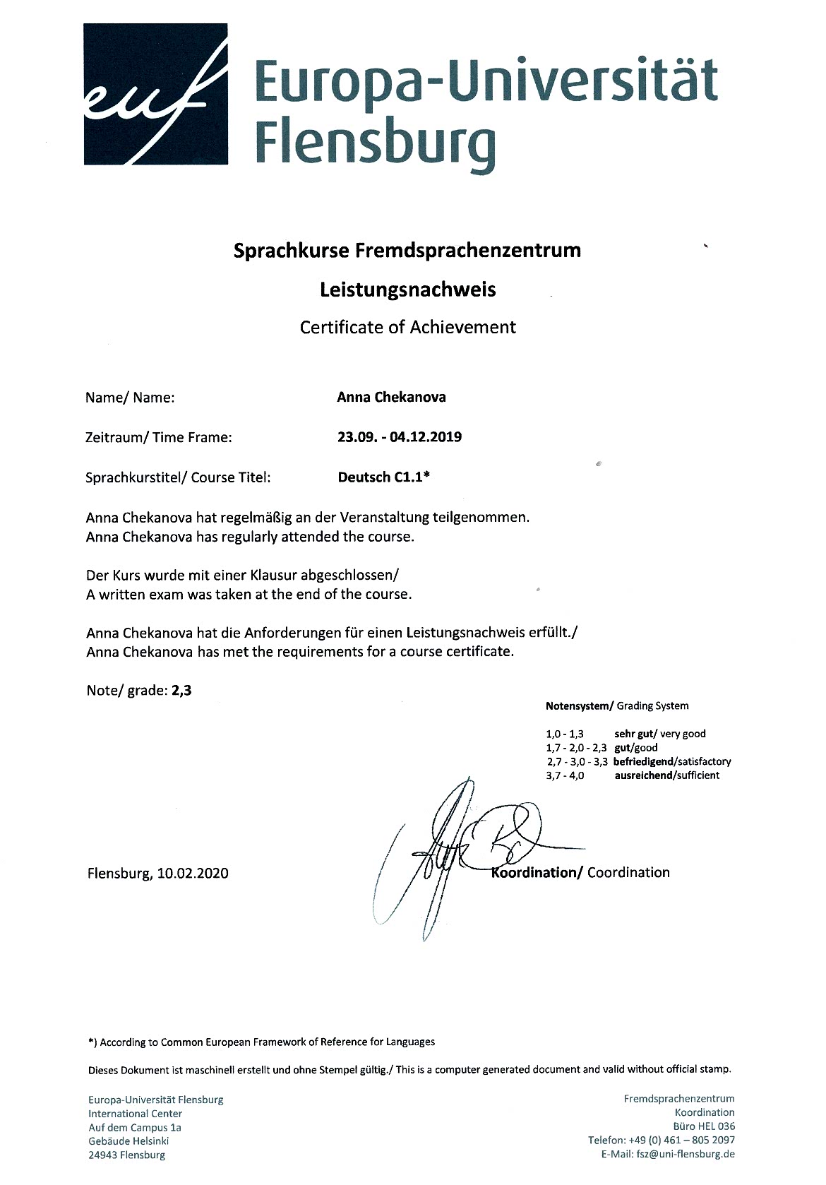 освоила курс немецкого языка С1.1 в Центре иностранных языков при университете г. Фленсбурга (Германия)