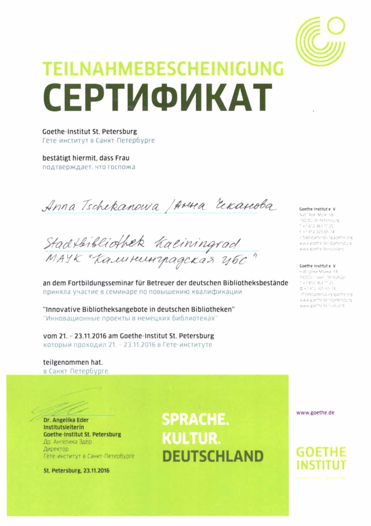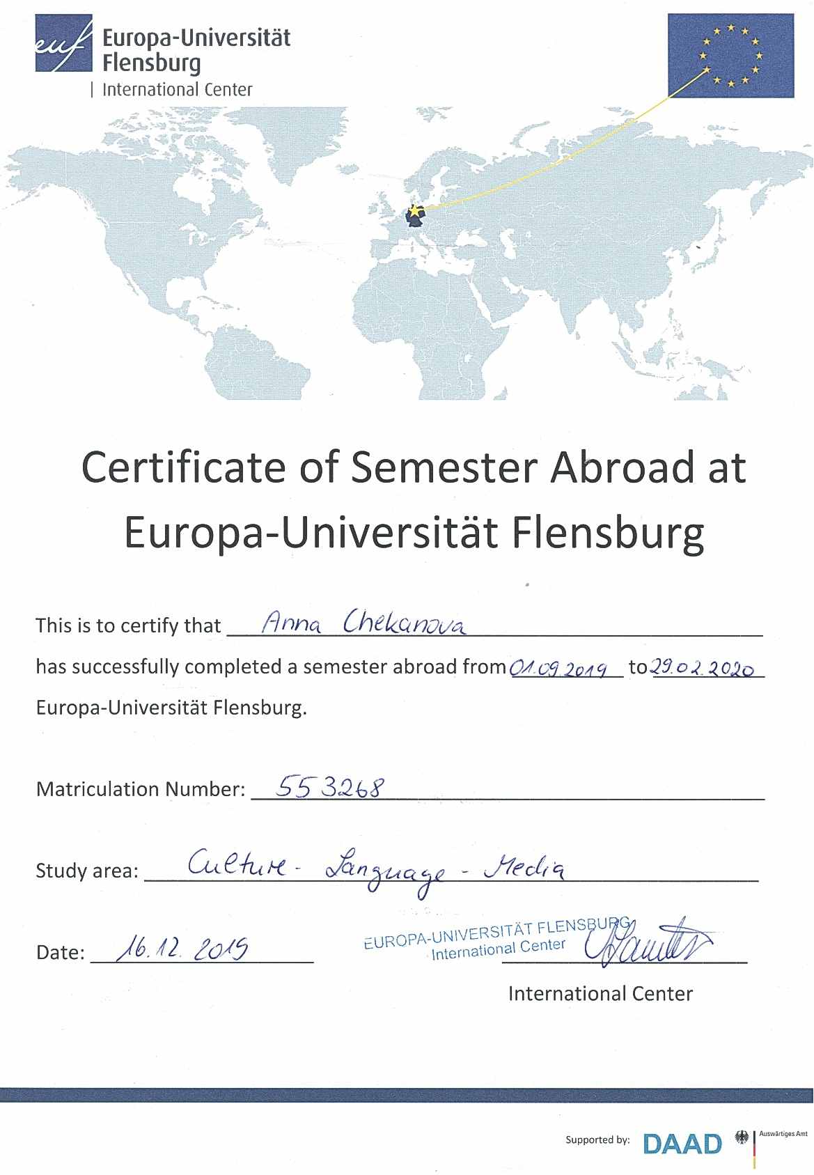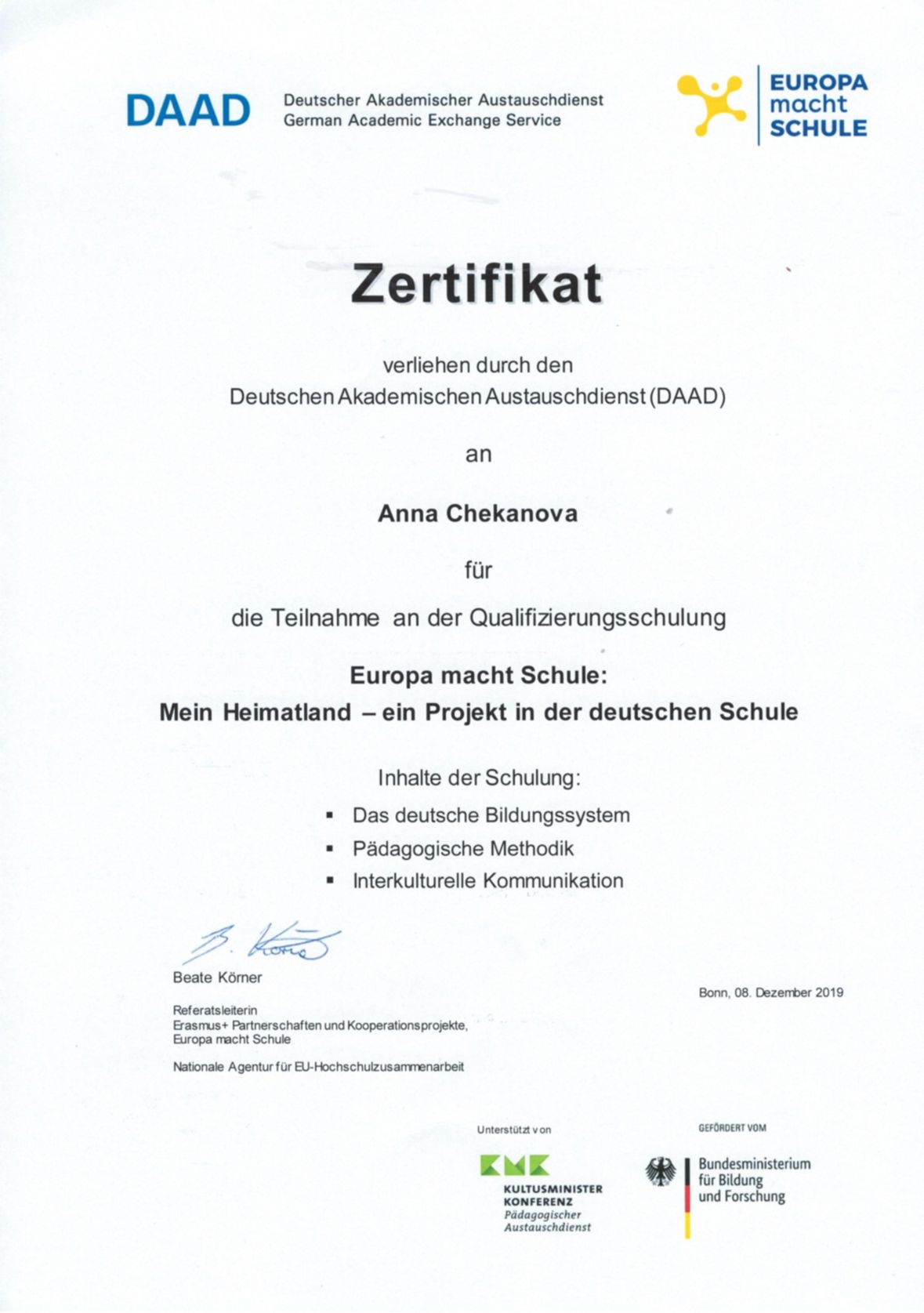 освоила курс немецкого языка С1.1 в Центре иностранных языков при университете г. Фленсбурга (Германия)