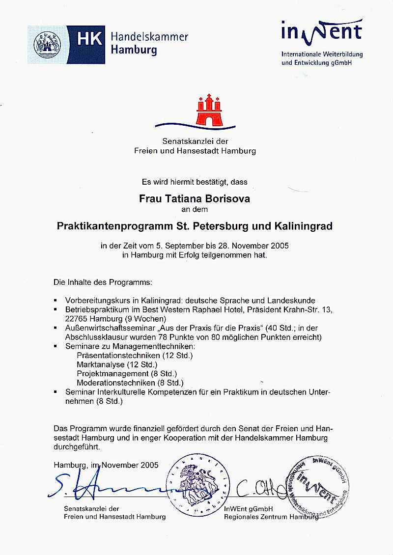 участница программы стажировки Торговой Палаты г. Гамбурга (Hamburg, Deutschland)