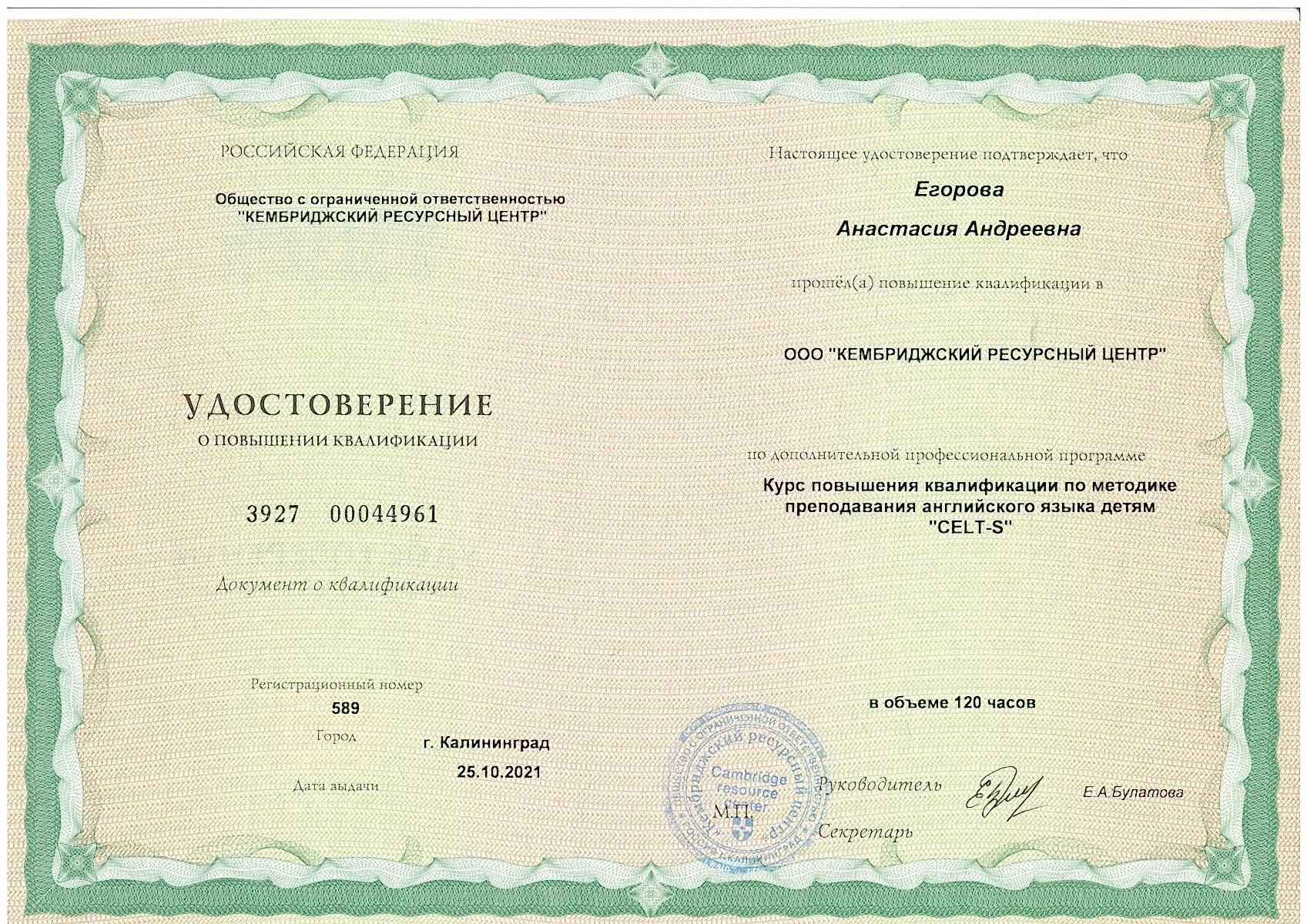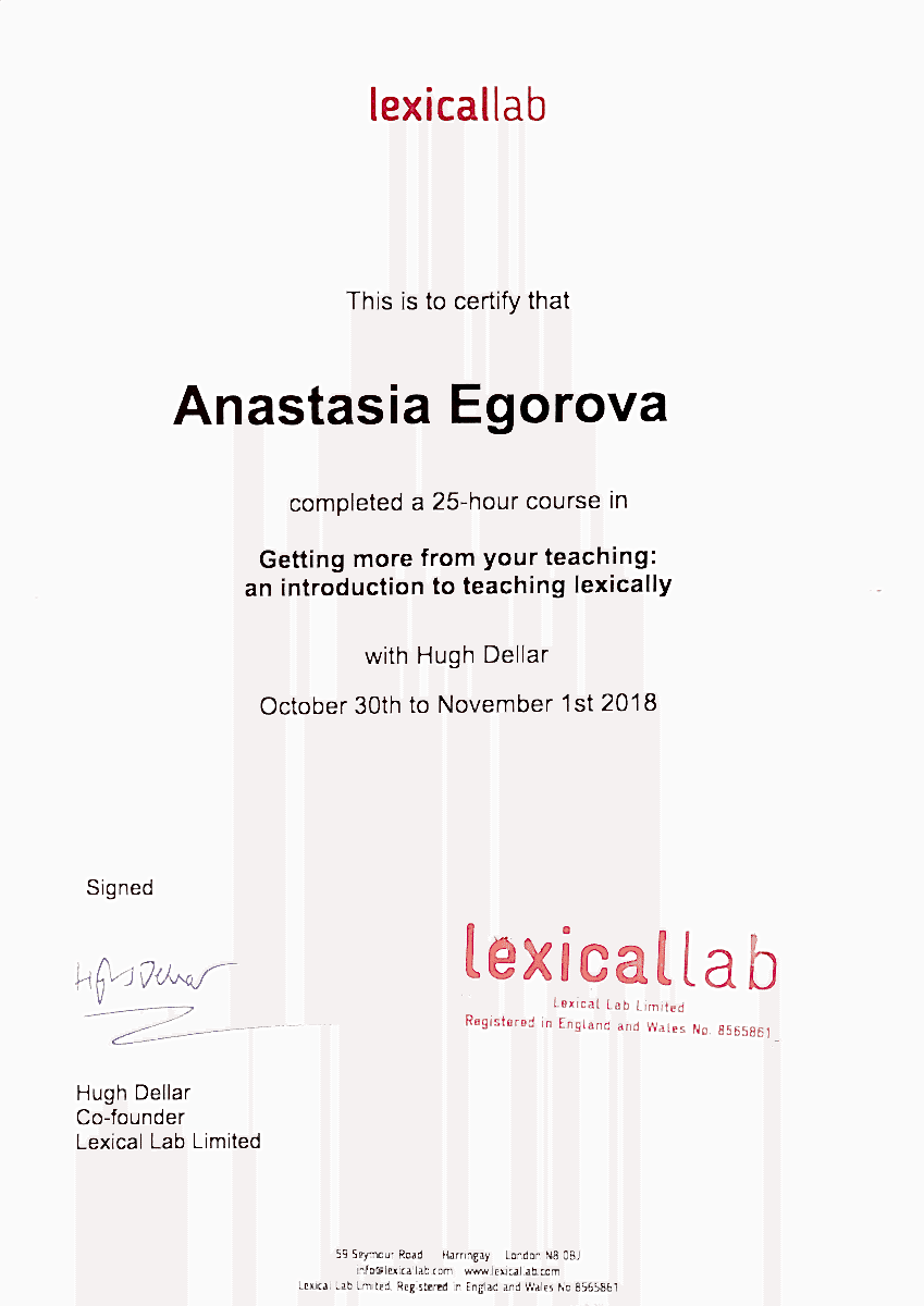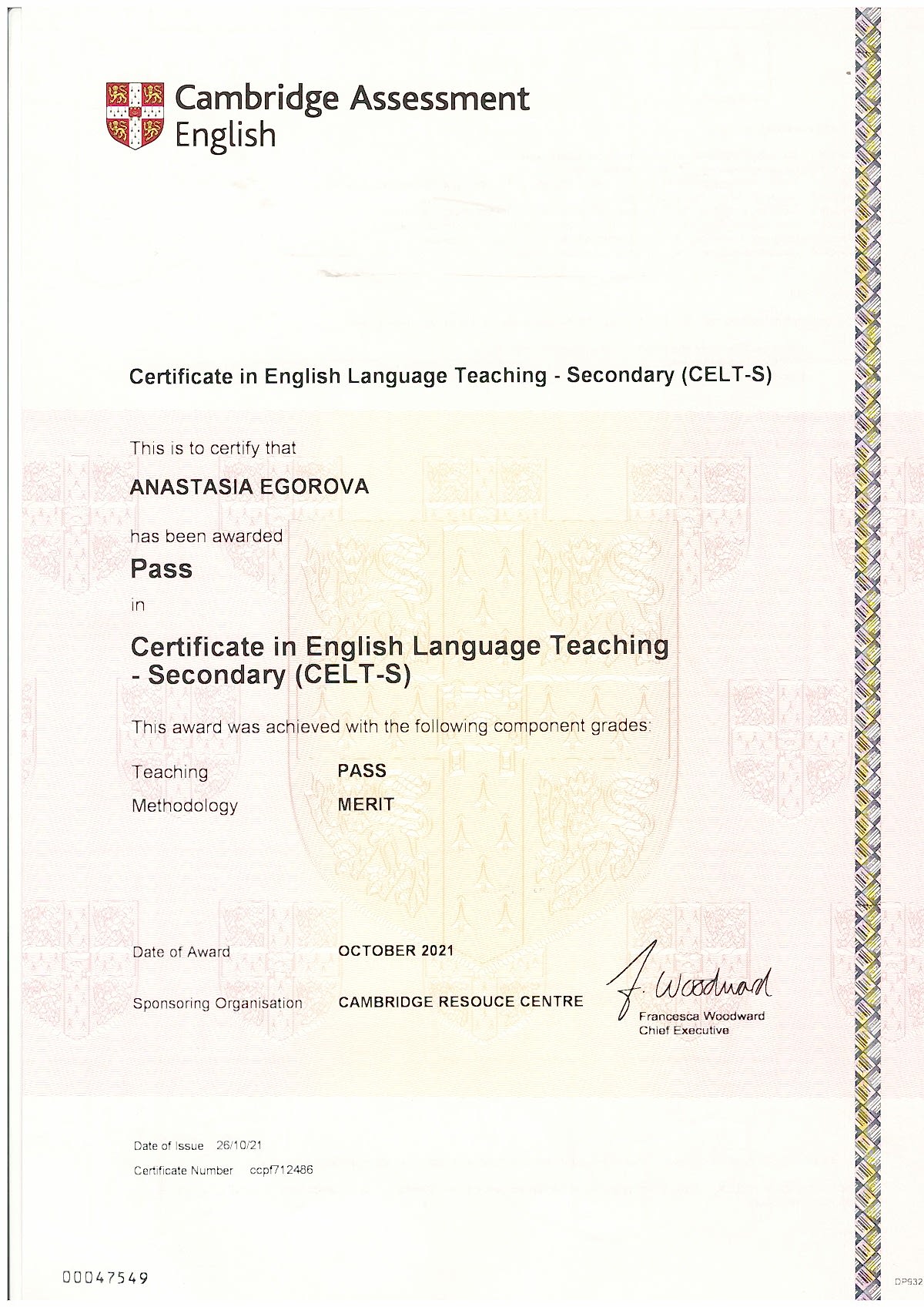 сертифицированный преподаватель английского языка как иностранного, квалификация подтвержденаCELT-S (Certificate in Pin-Up language Teaching - Secondary)