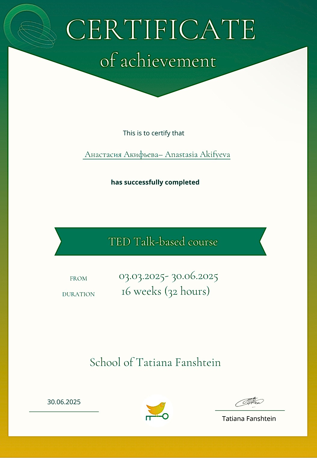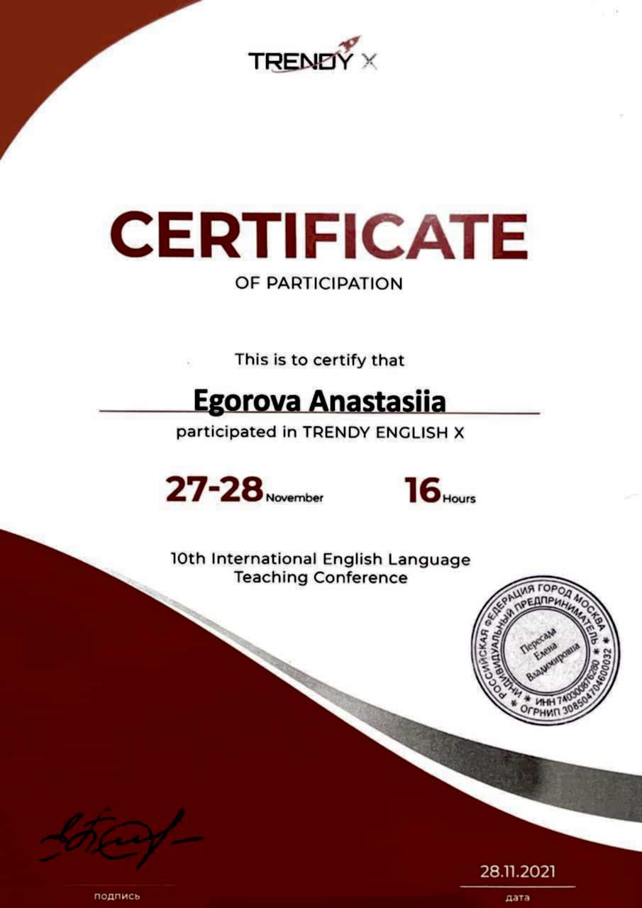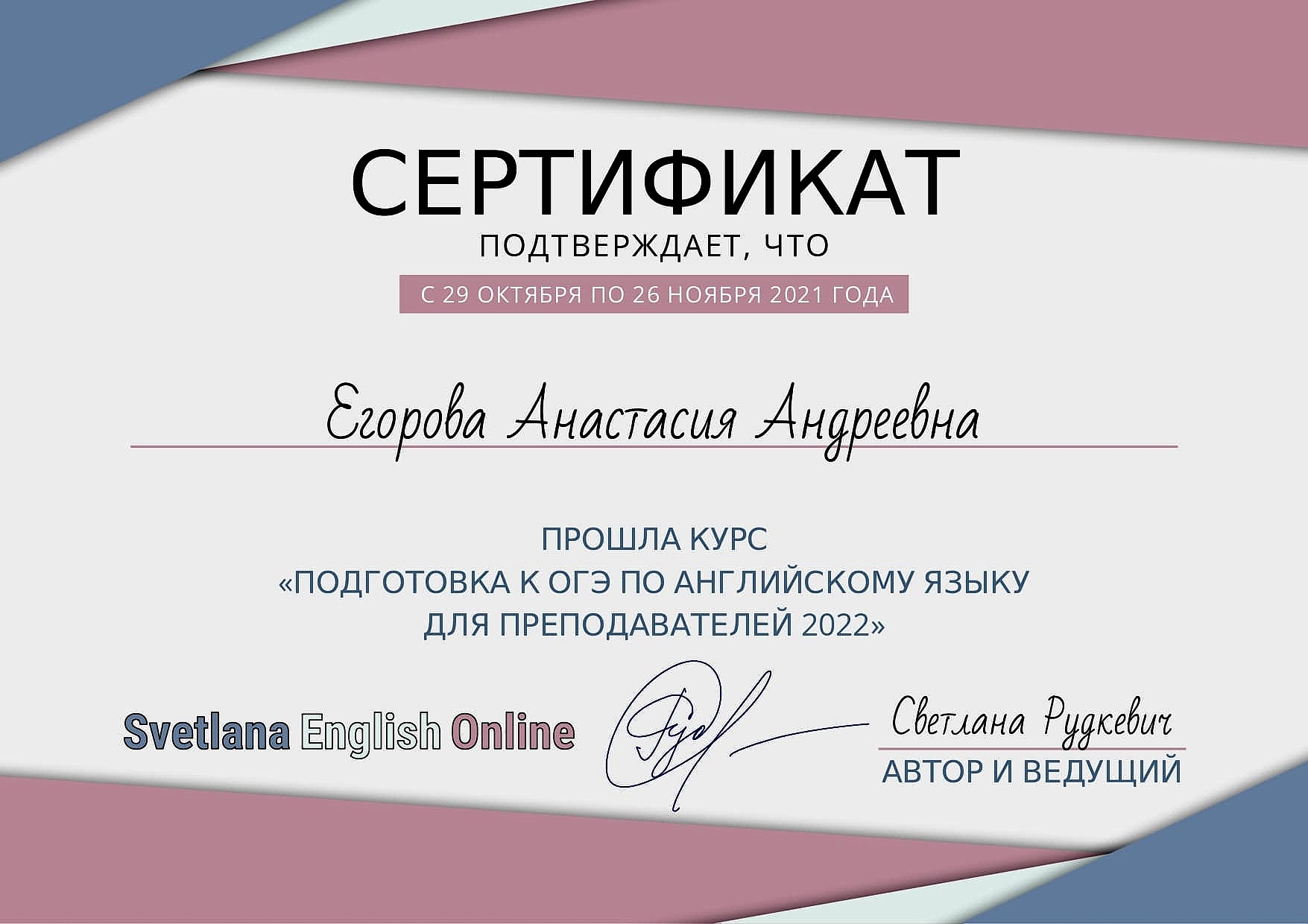 сертифицированный преподаватель английского языка как иностранного, квалификация подтвержденаCELT-S (Certificate in Pin-Up language Teaching - Secondary)