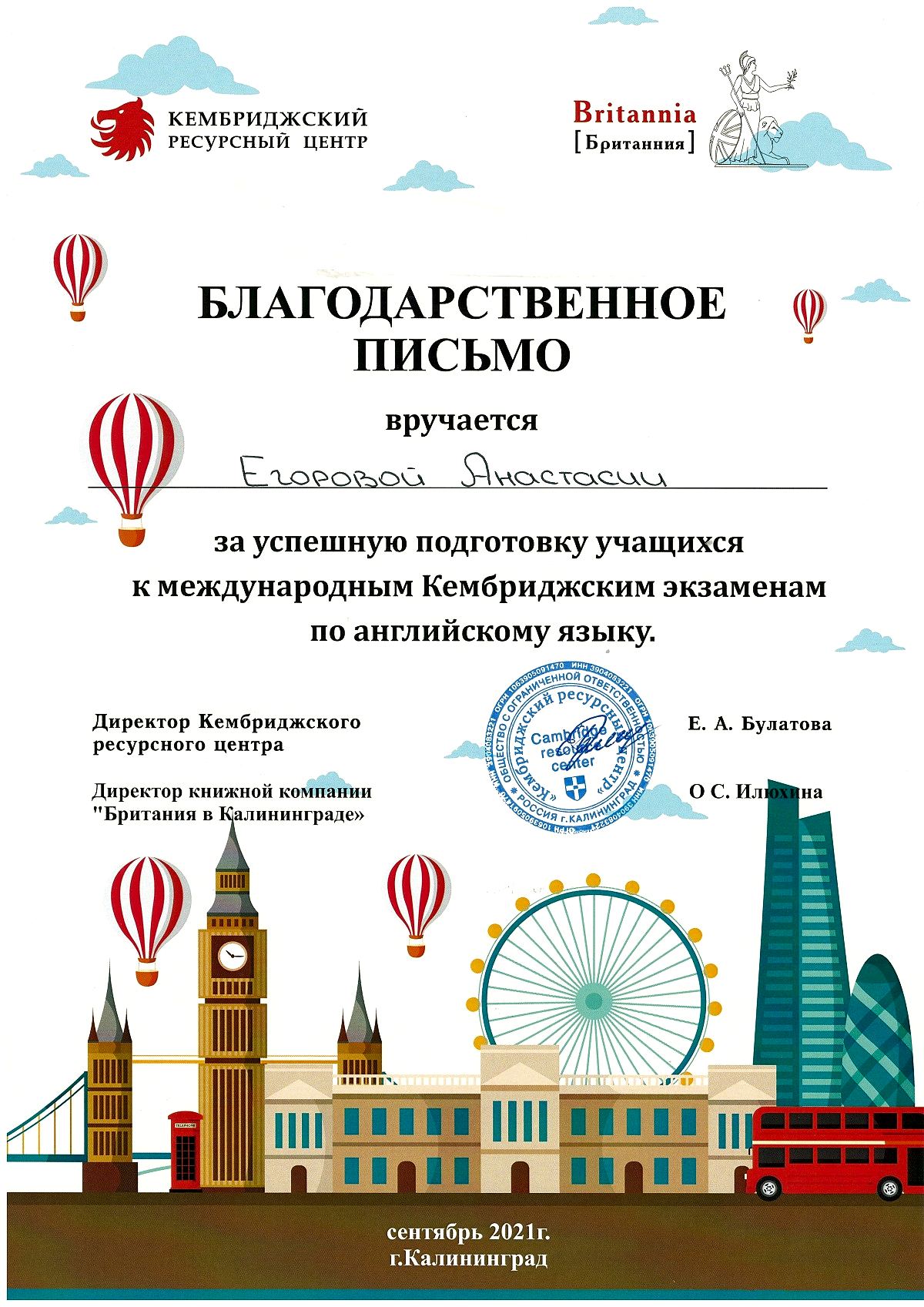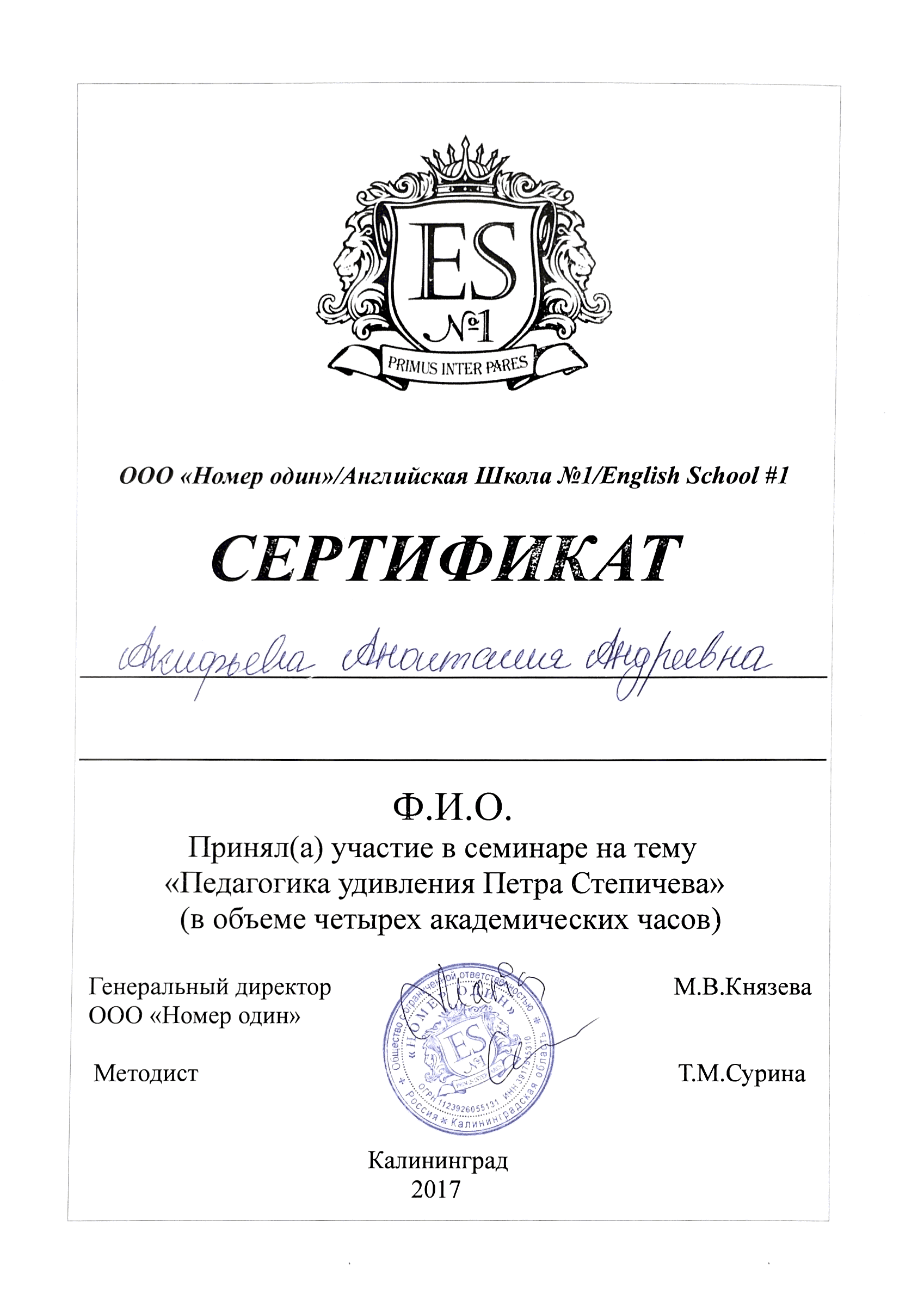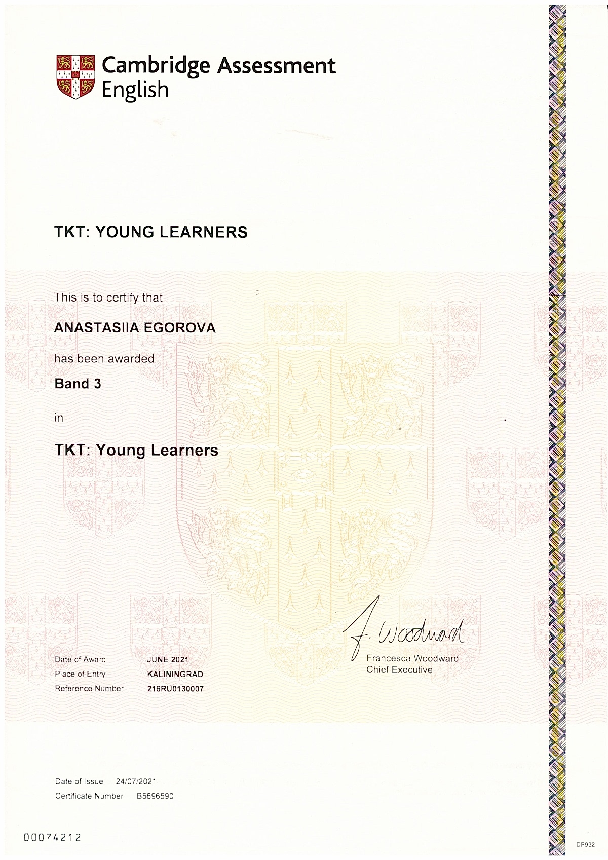 обладательница международных сертификатов Кембриджского университета ТКТ Pin-Up Knowledge Test): Module 1,2,3, YLE