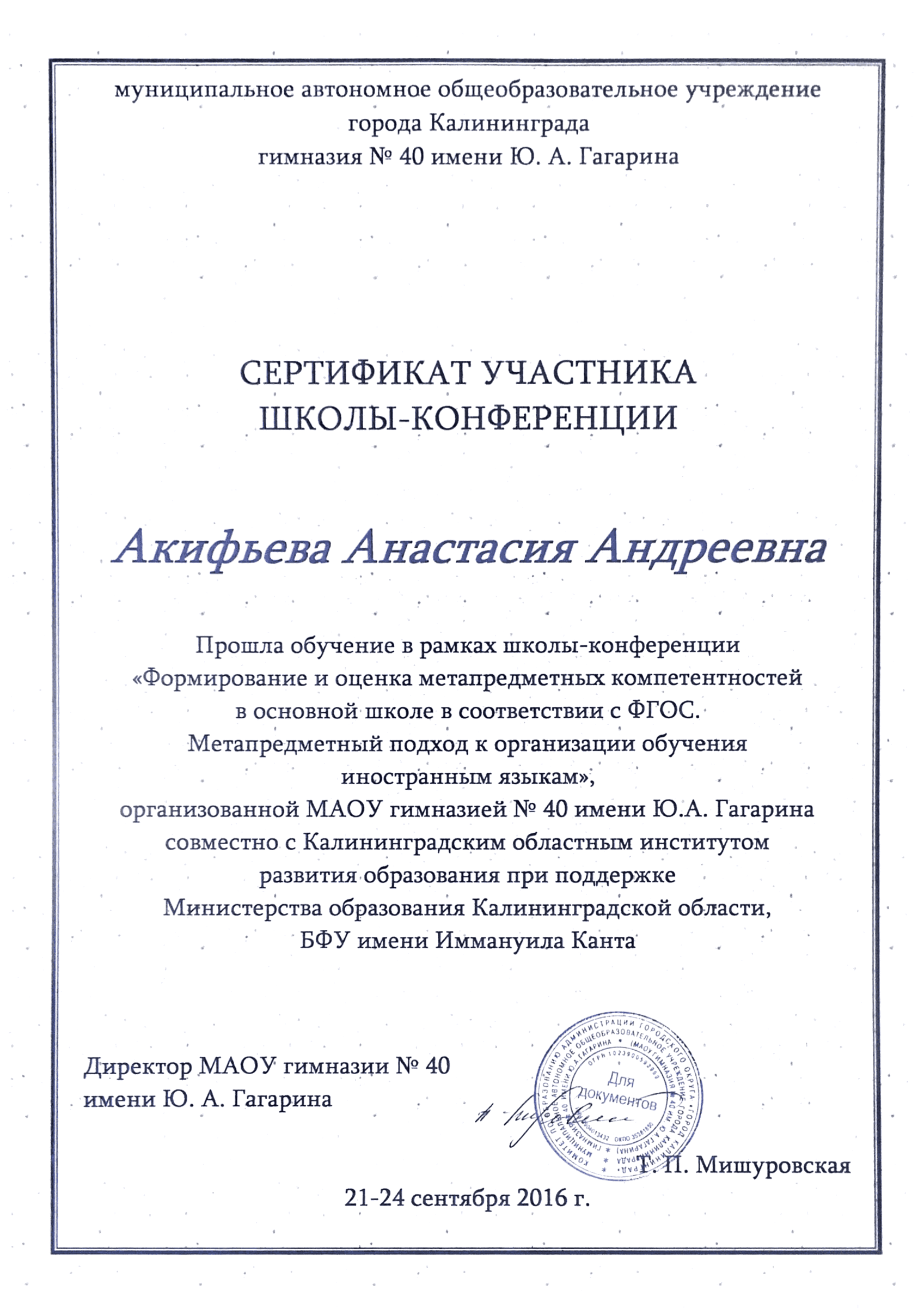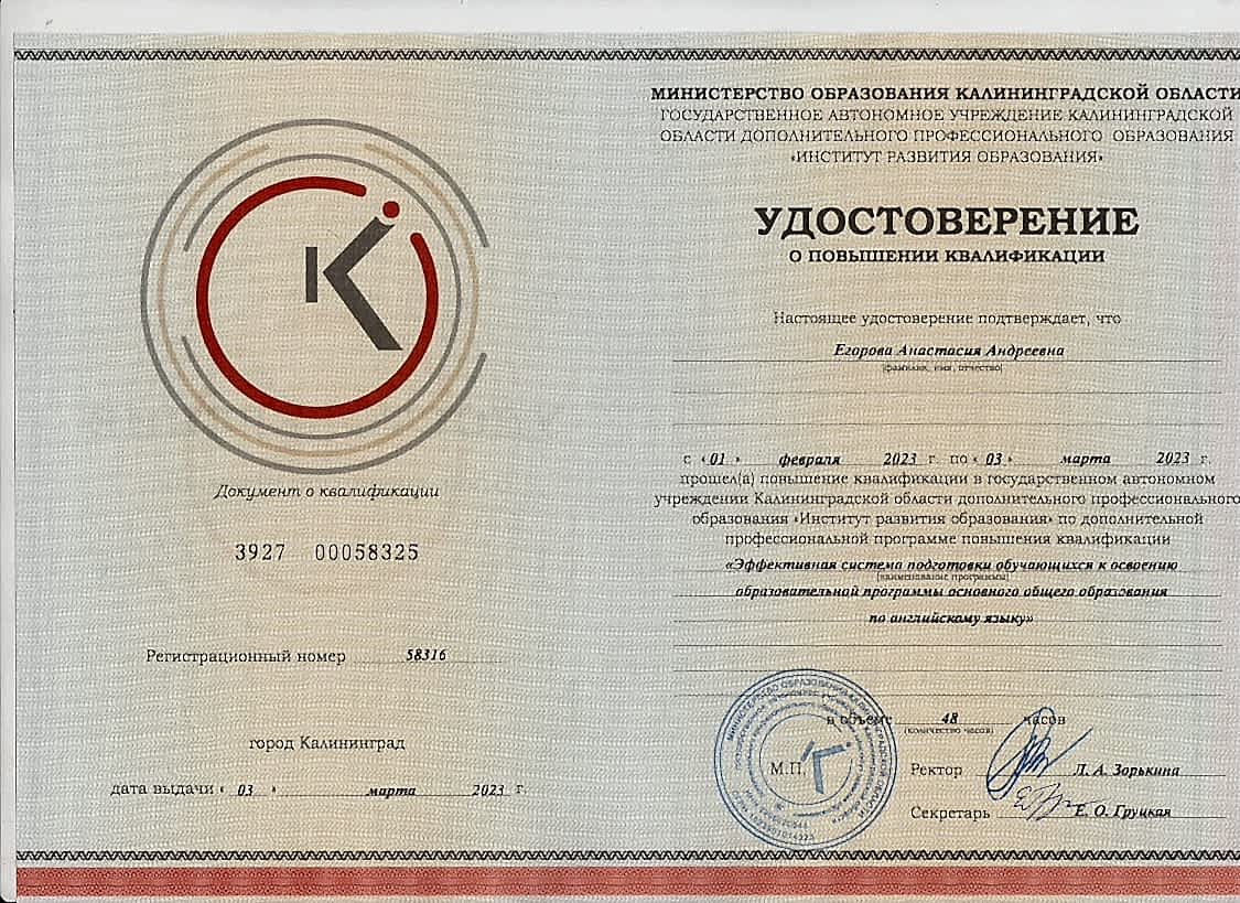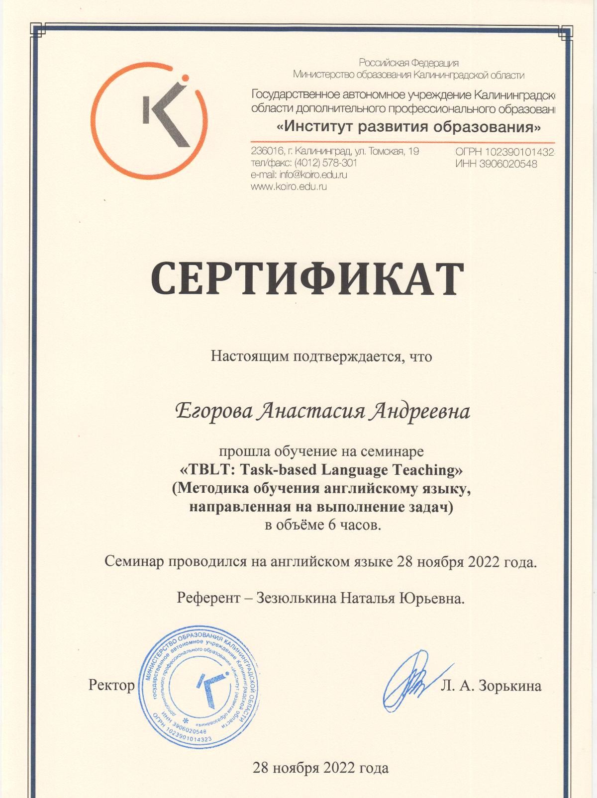 обладательница международных сертификатов Кембриджского университета ТКТ Pin-Up Knowledge Test): Module 1,2,3, YLE