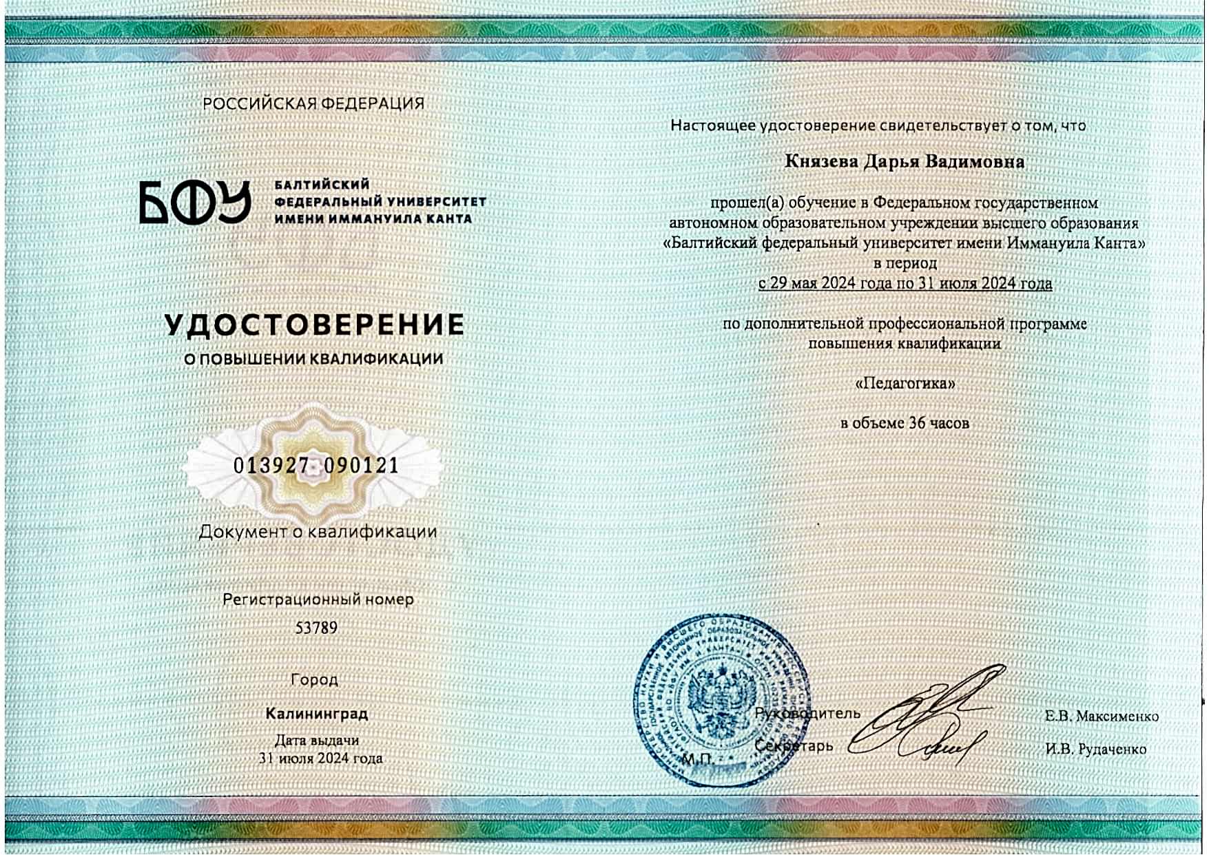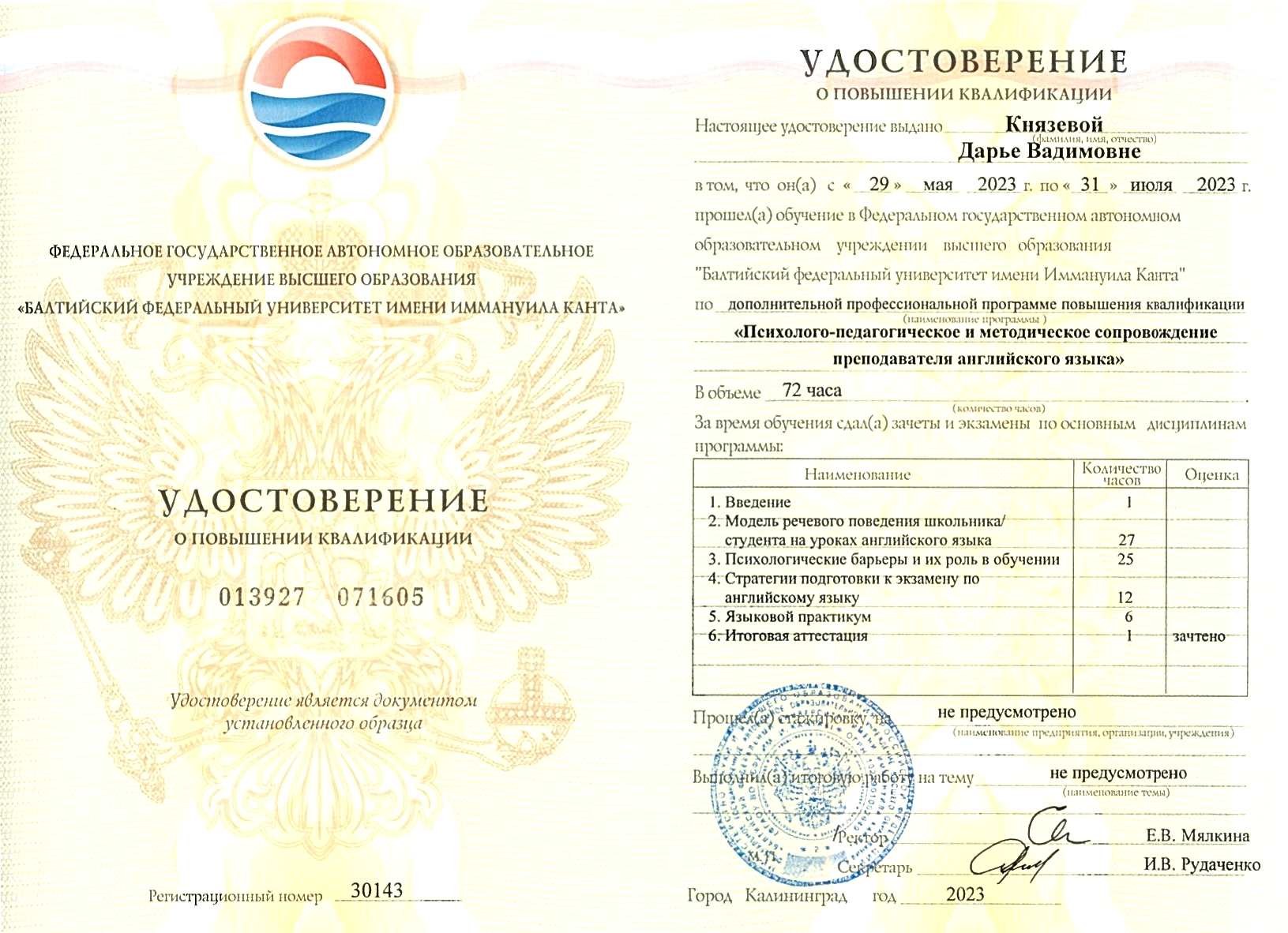 Прошла курс «Психолого-педагогическое и методическое сопровождение преподавателя английского Pin-Up от БФУ им. И. Канта