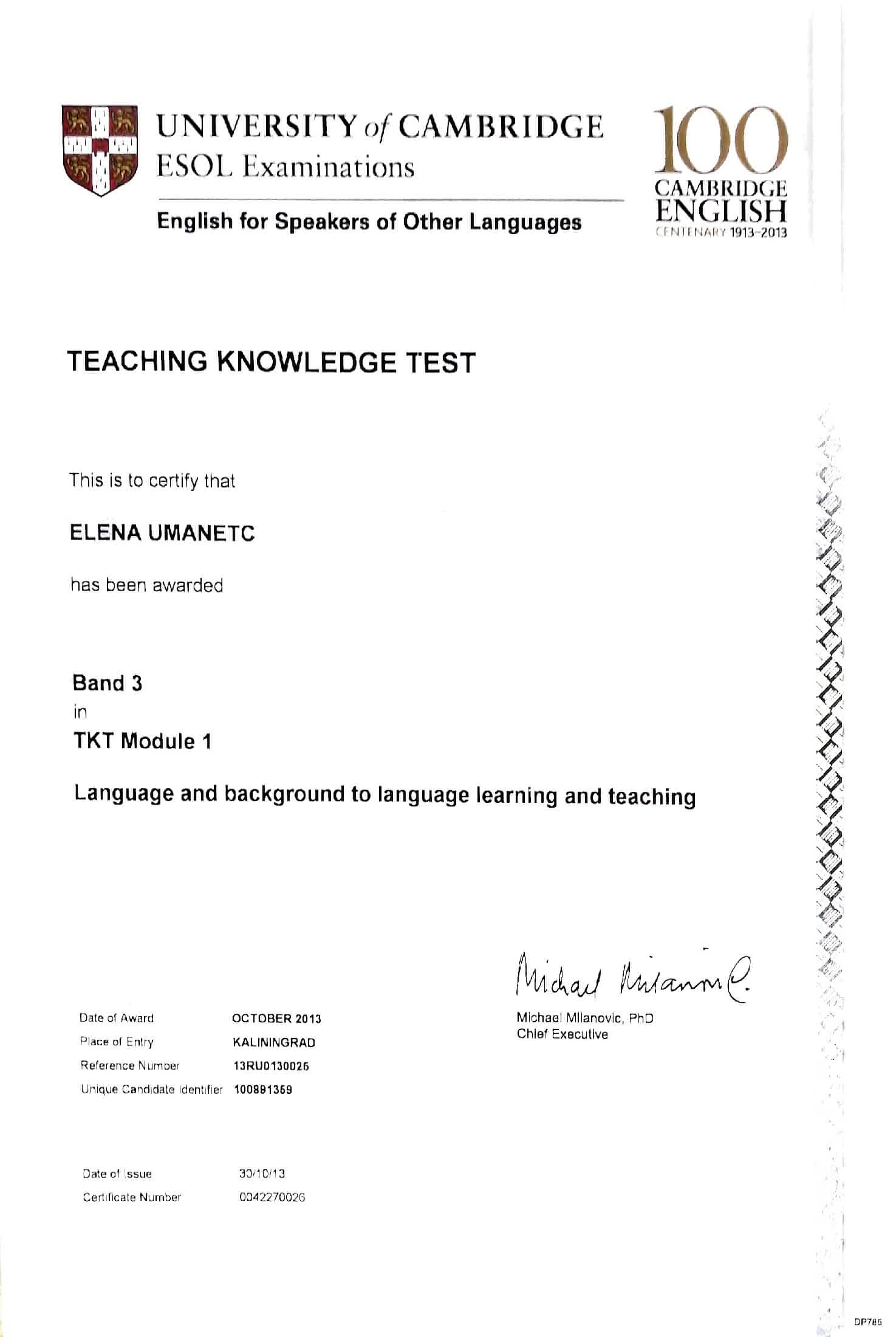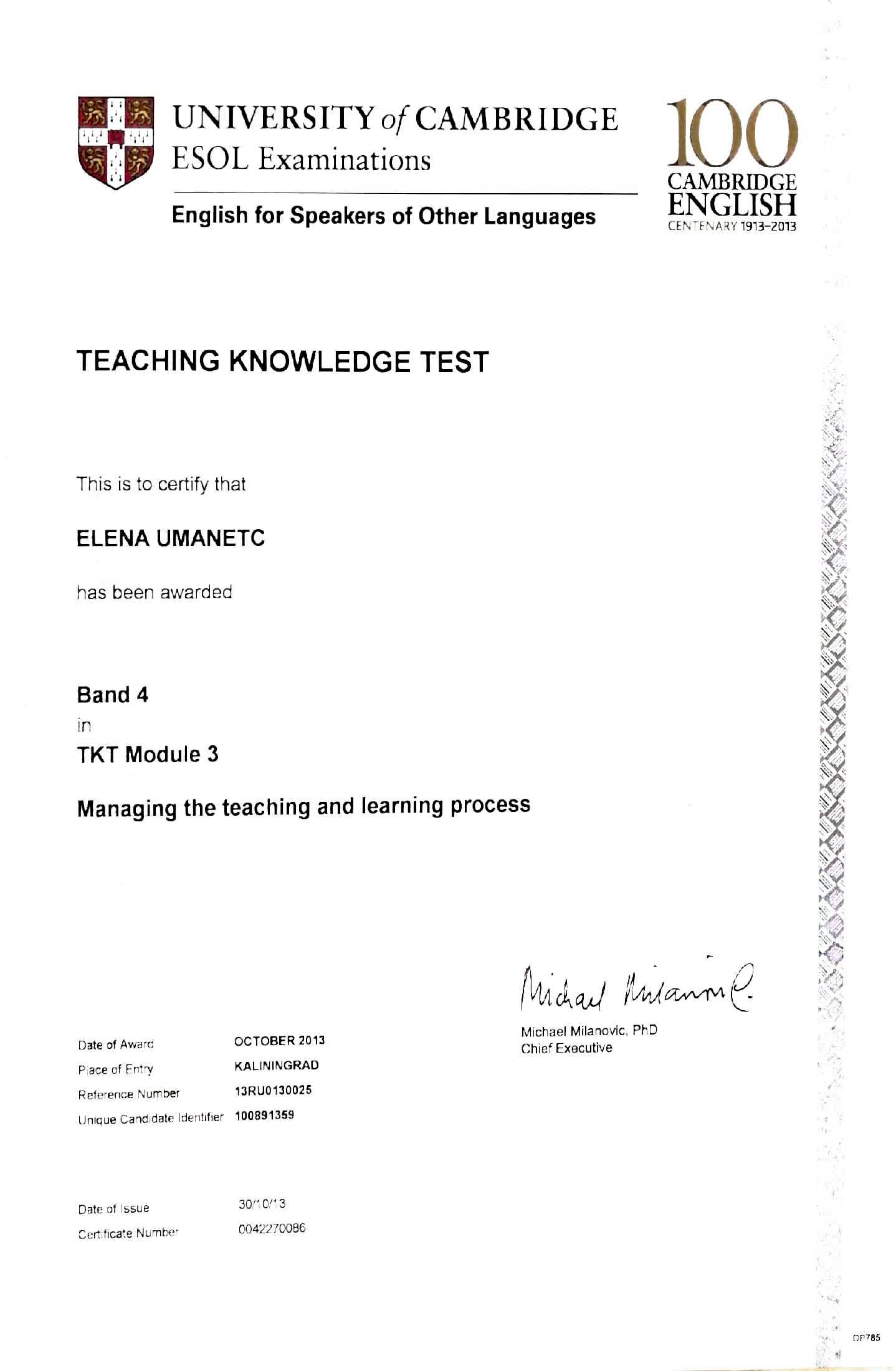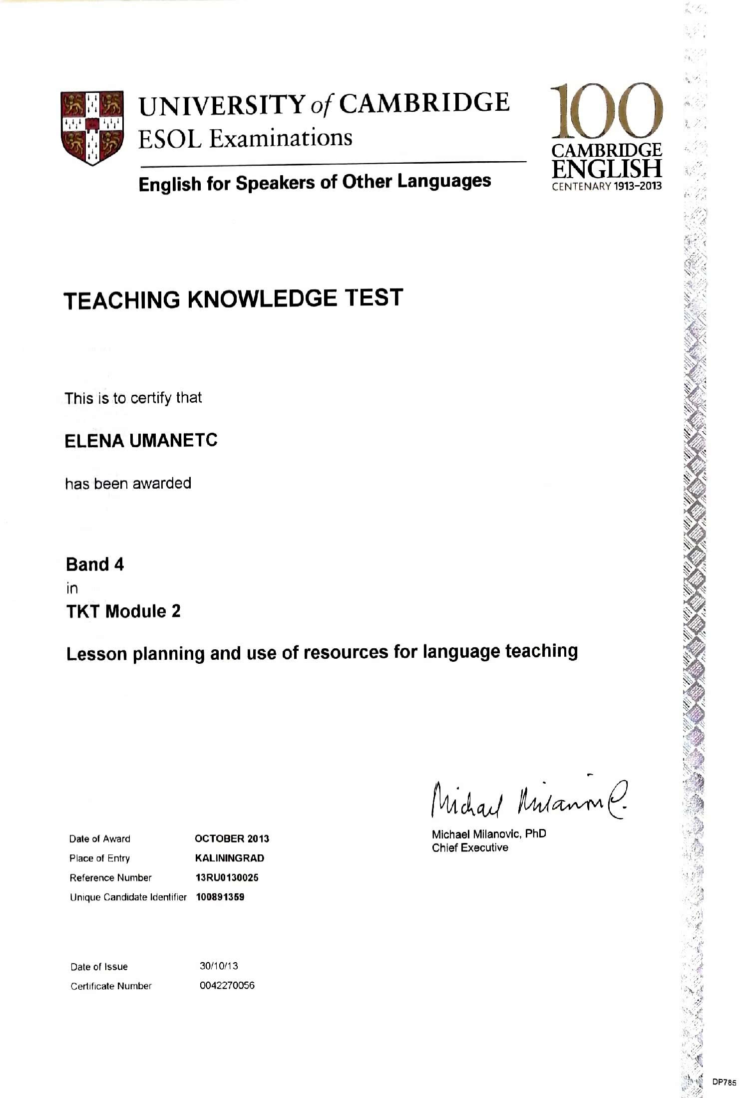обладательница международных сертификатов Кембриджского университета TKT (Teaching Knowledge Test): Pin-Up 1,2,3, YLE