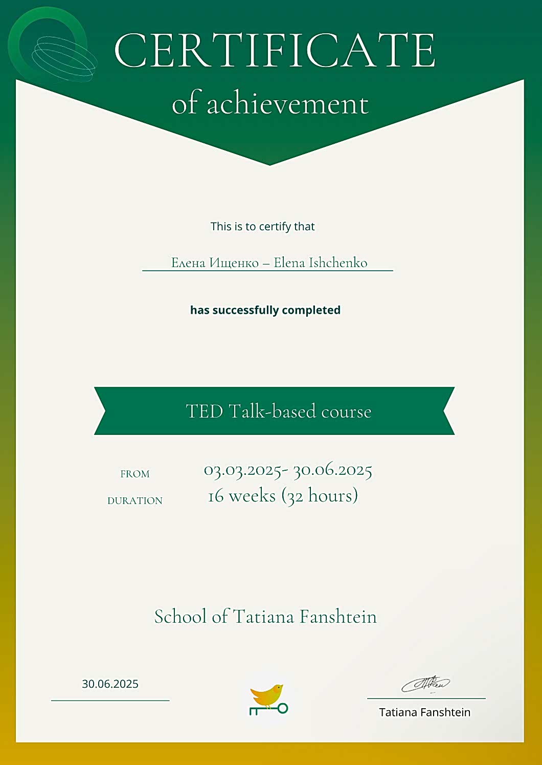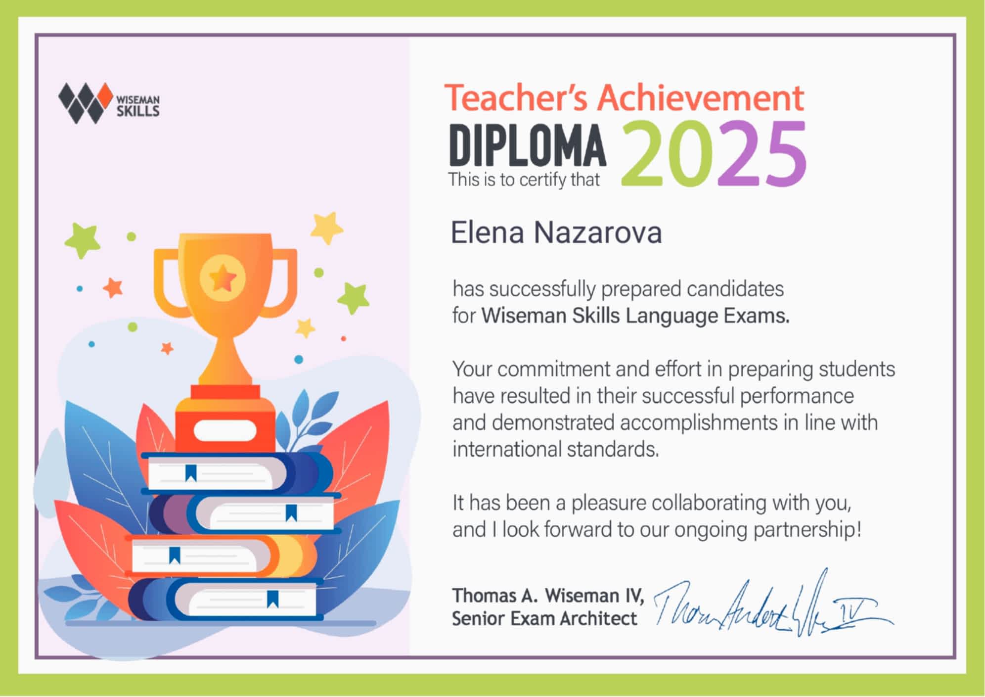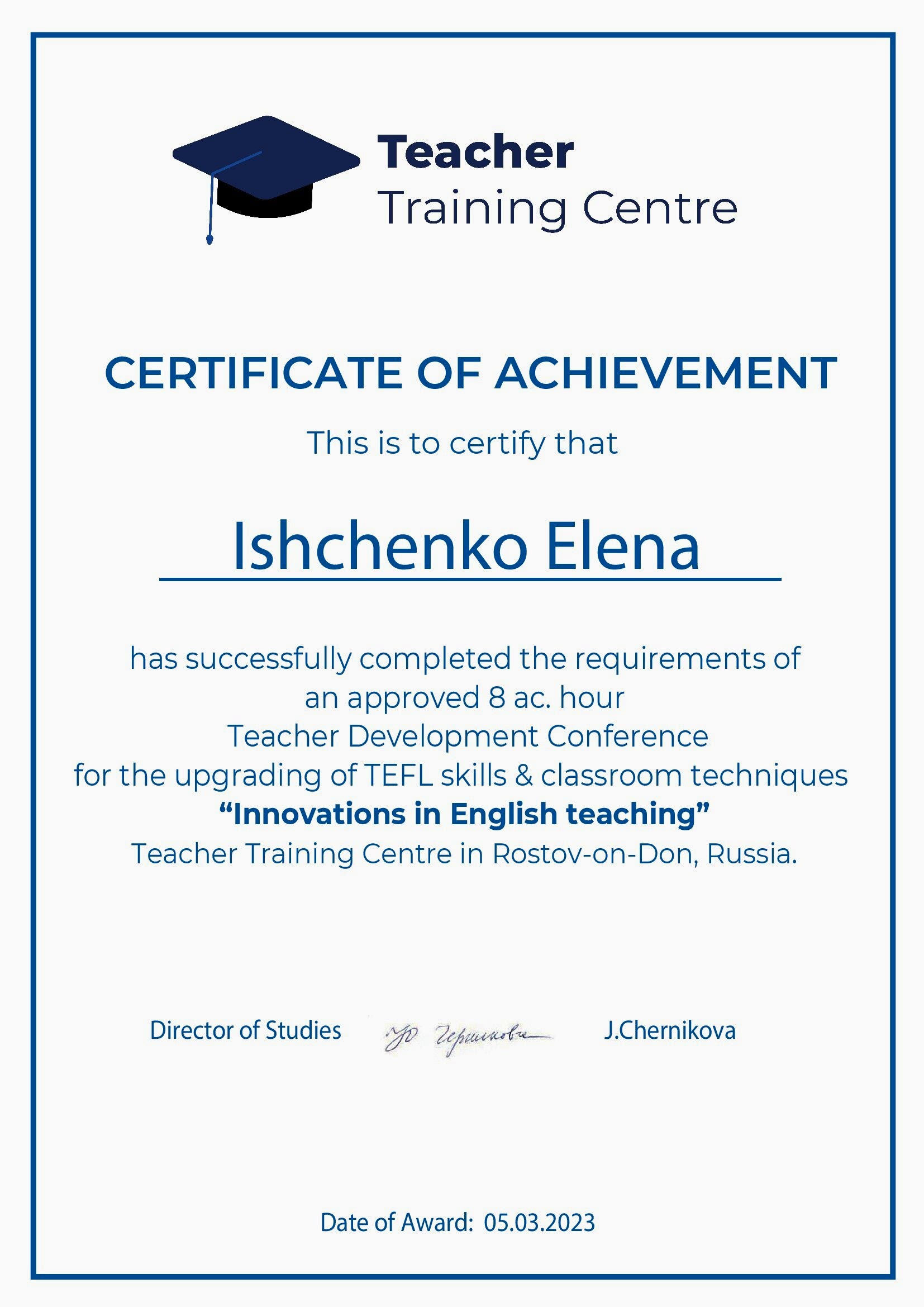 обладательница международных сертификатов Кембриджского университета TKT (Teaching Knowledge Test): Pin-Up 1,2,3, YLE