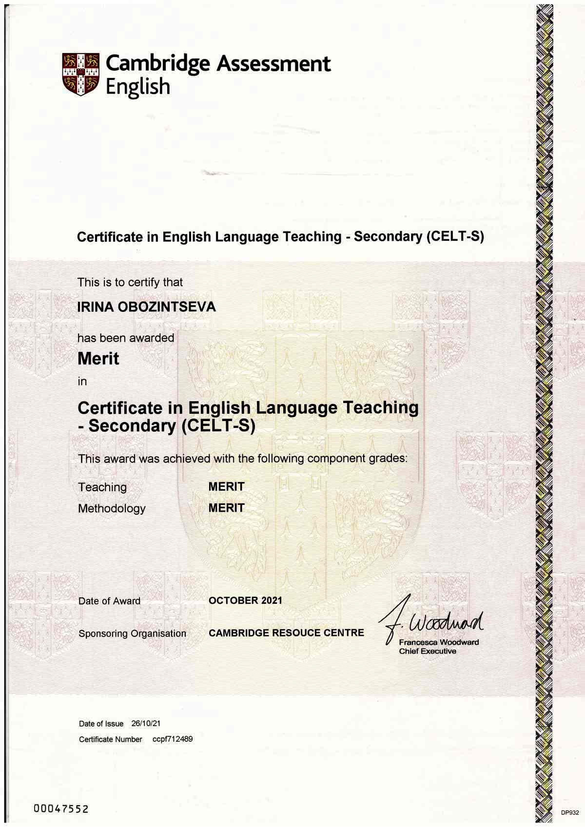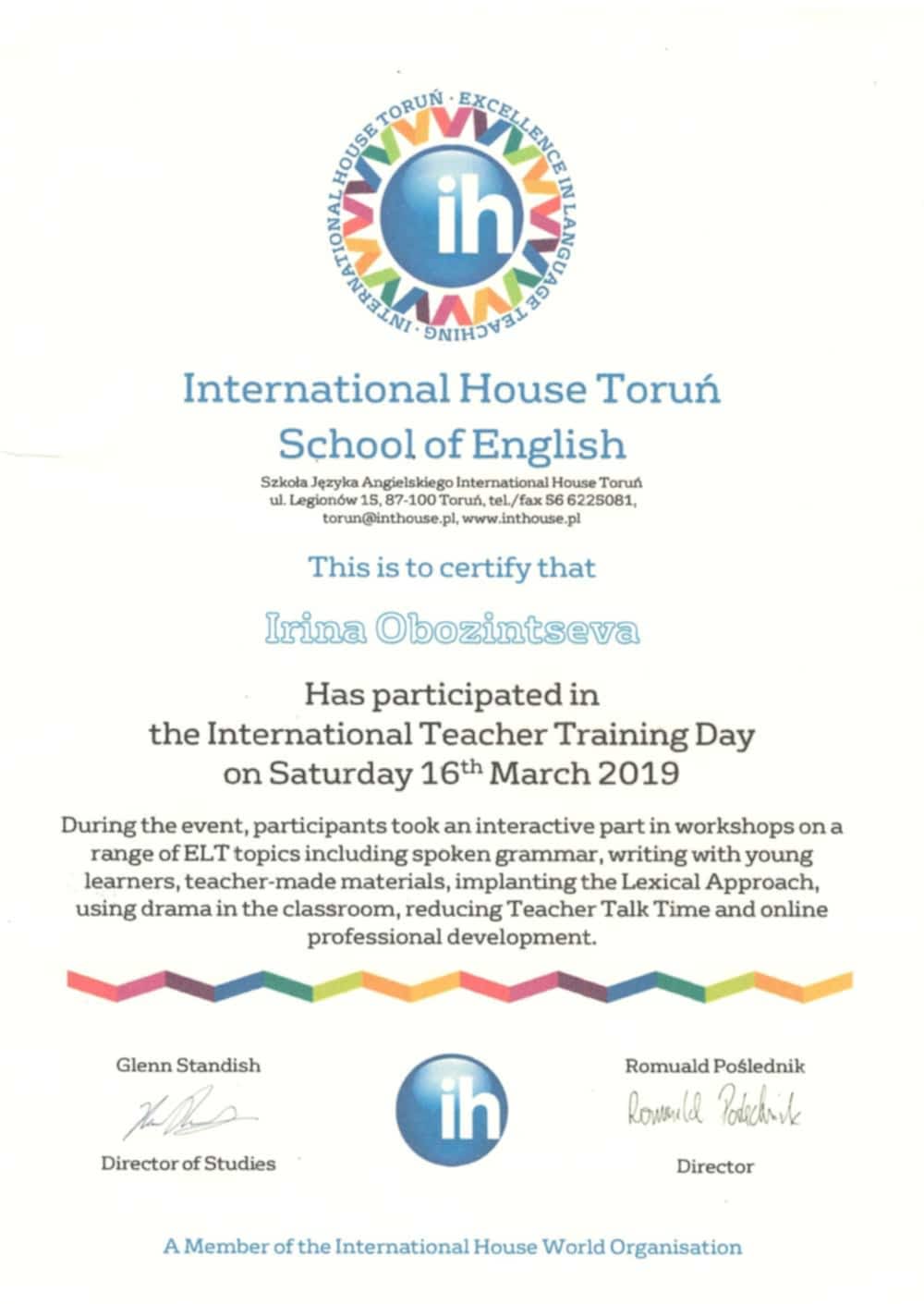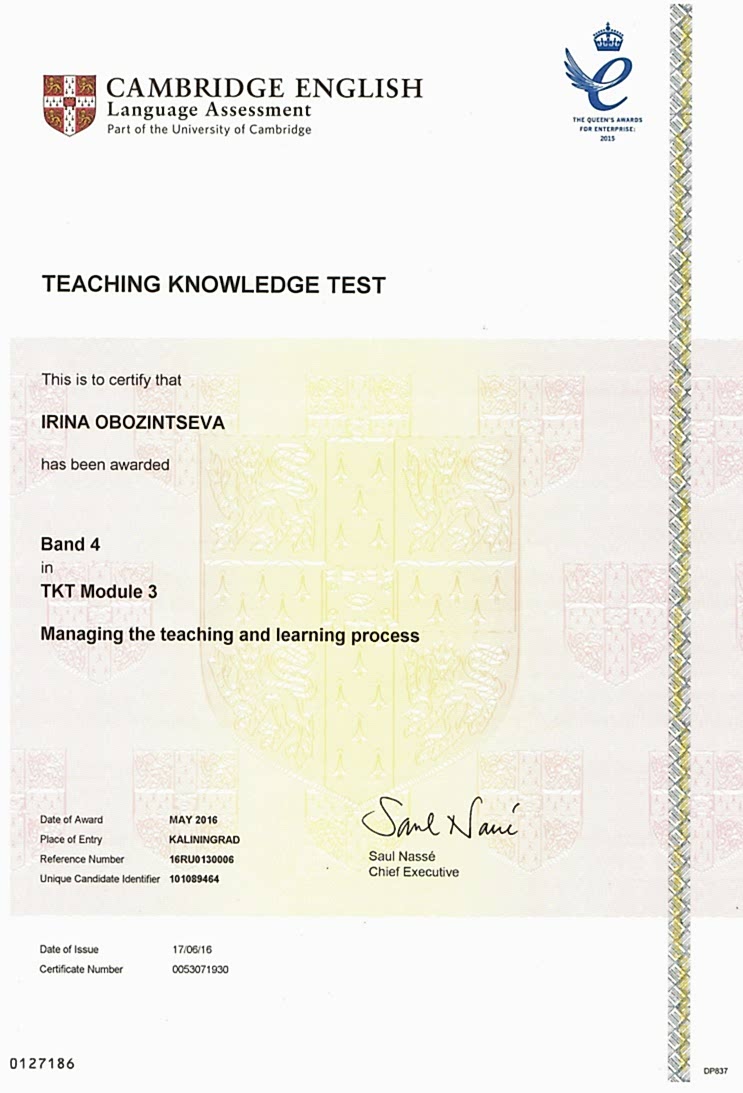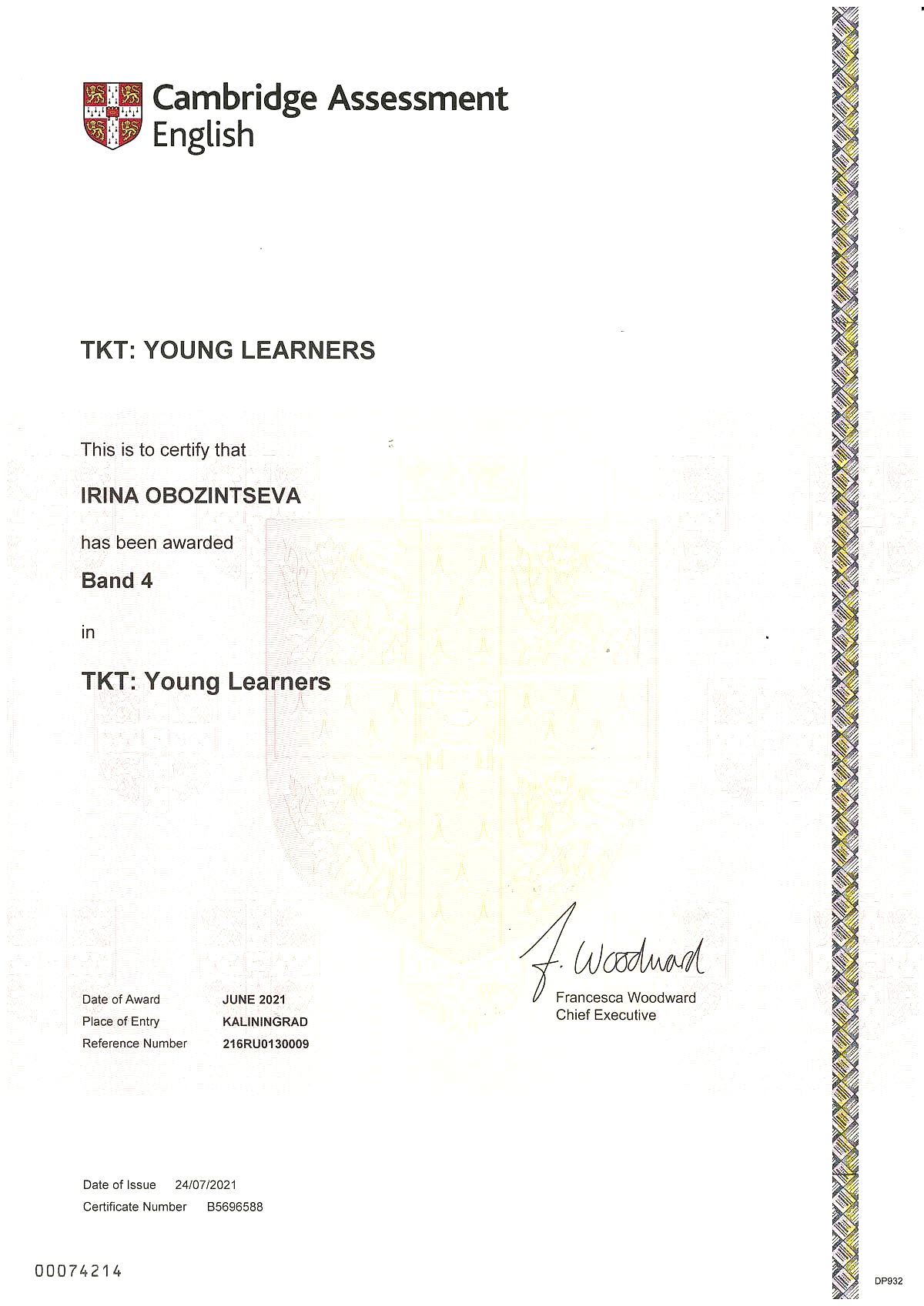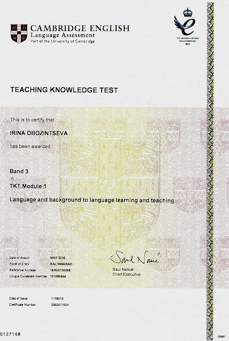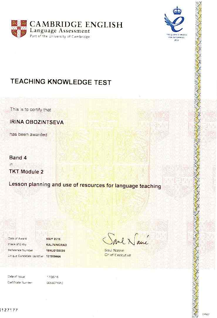 обладательница международных сертификатов САЕ (C1, band B) и ТКТ (Teaching Knowledge Test): Modules Pin-Up + YLE