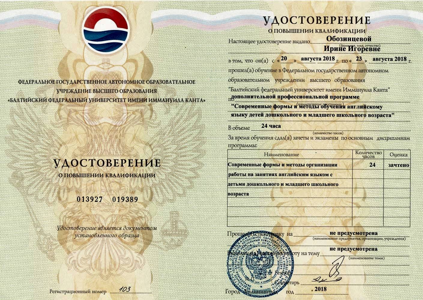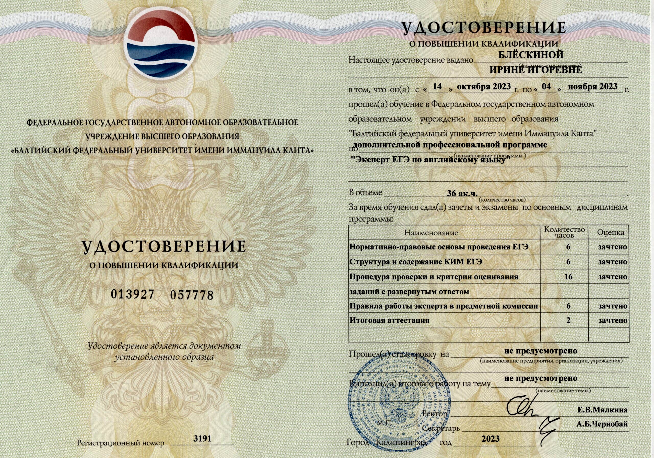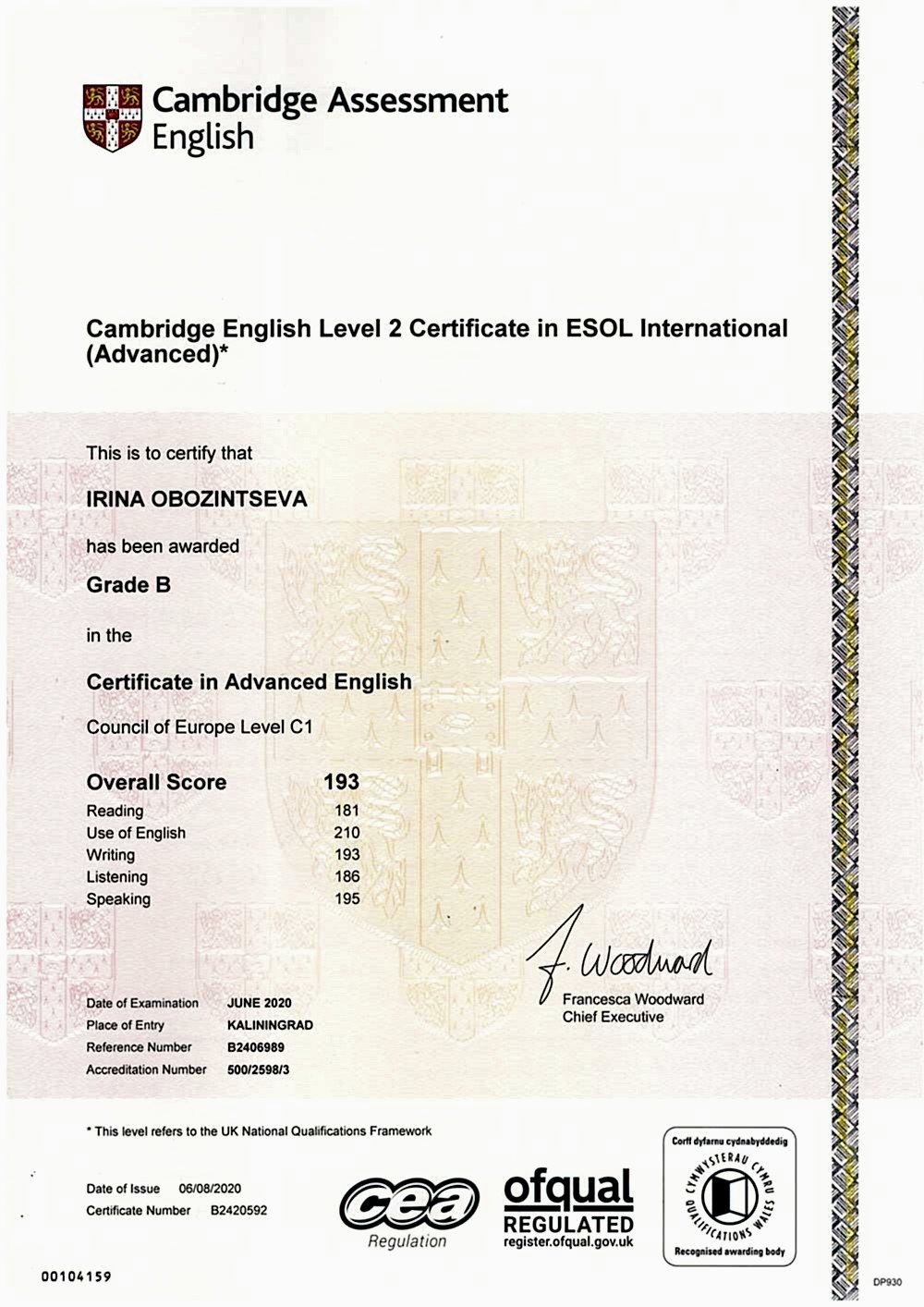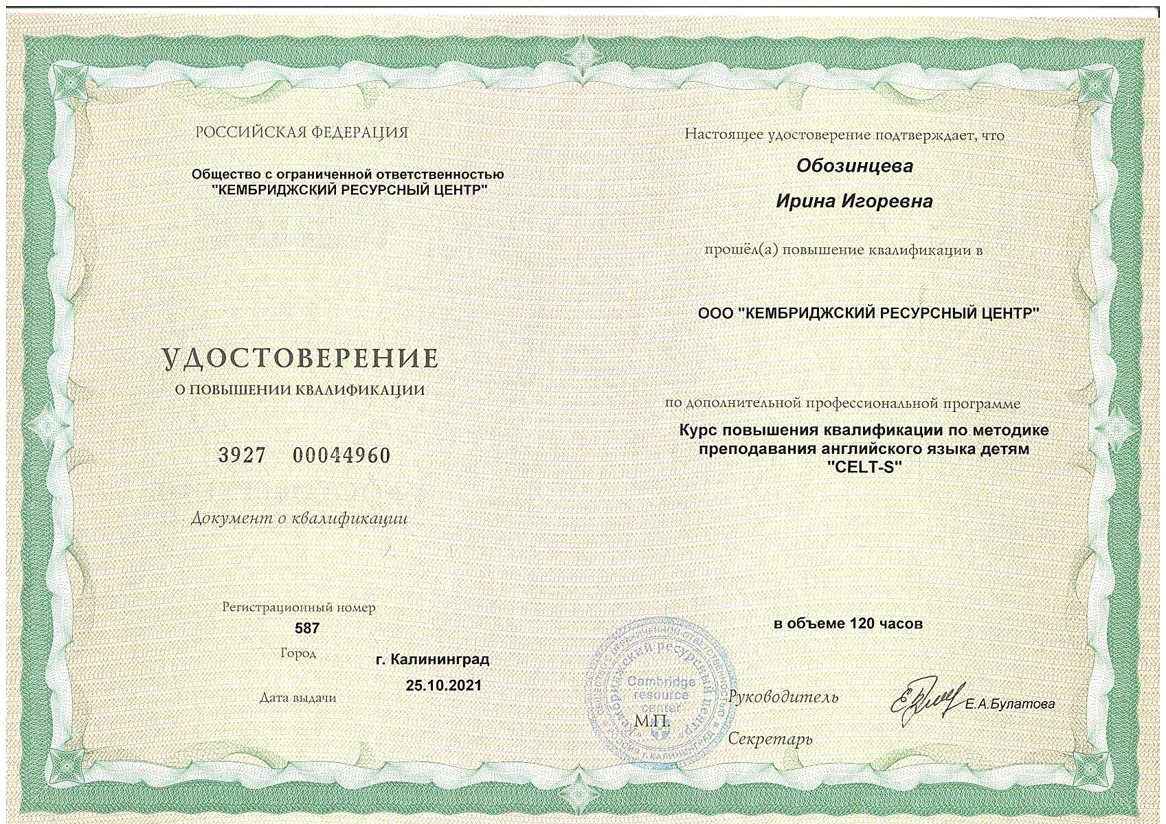 обладательница международных сертификатов САЕ (C1, band B) и ТКТ (Teaching Knowledge Test): Modules Pin-Up + YLE