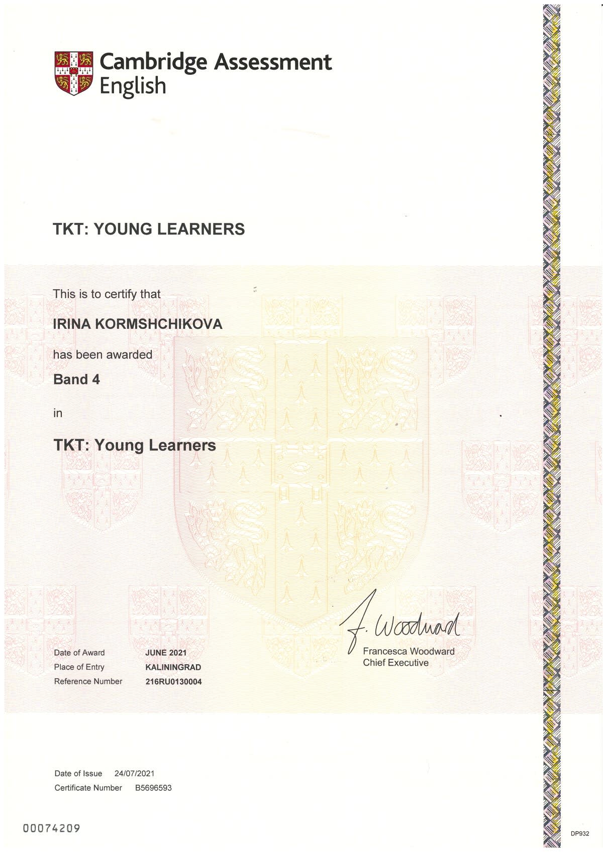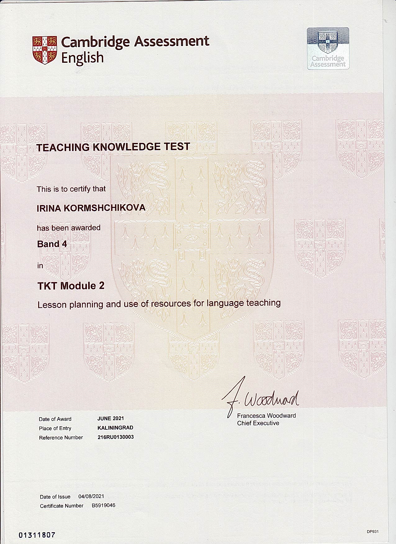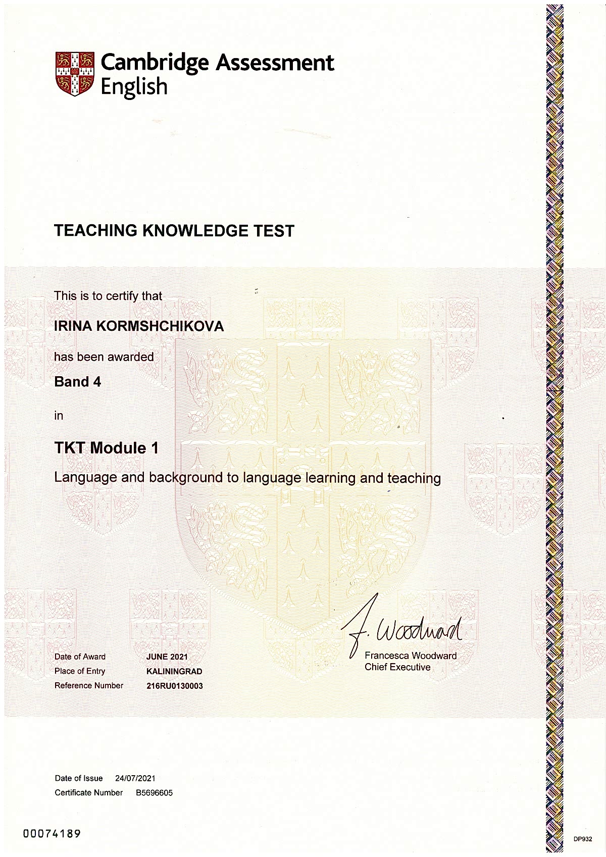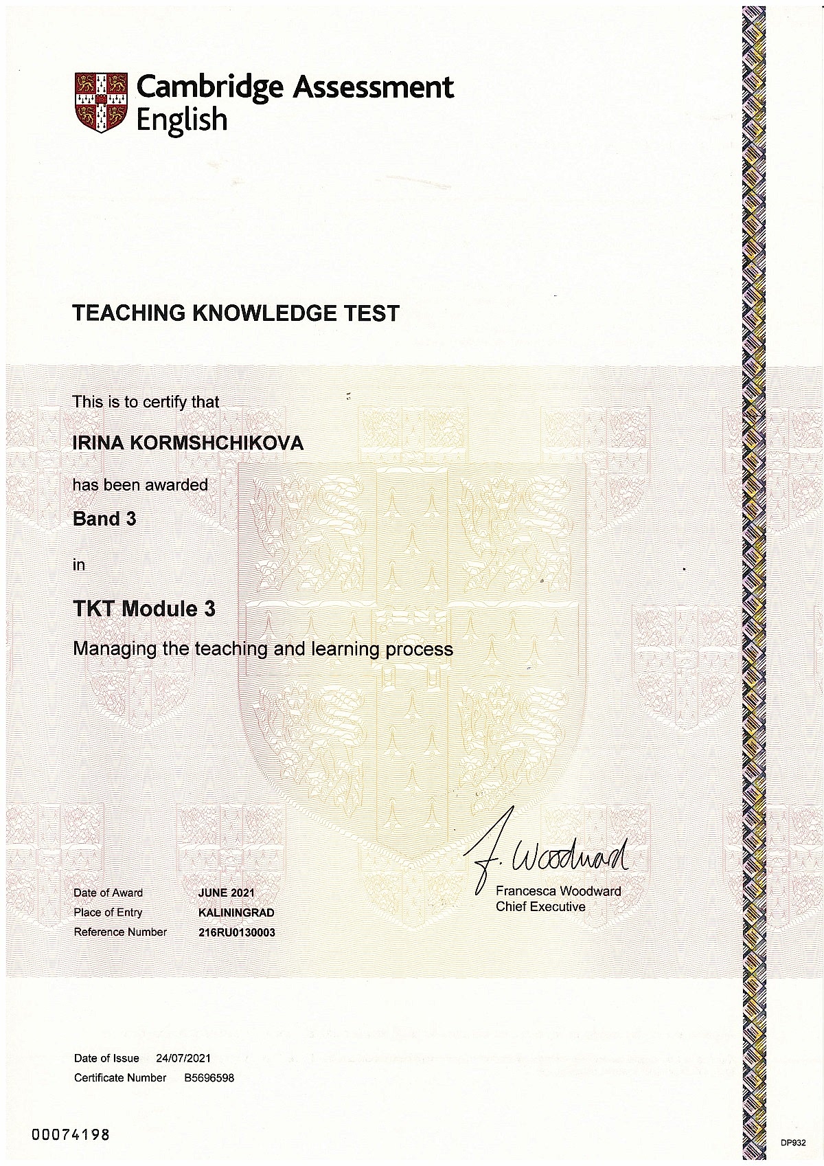 обладательница международных сертификатов Кембриджского Pin-Up TKT (Teaching Knowledge Test): Module 1, 2, 3, YLE