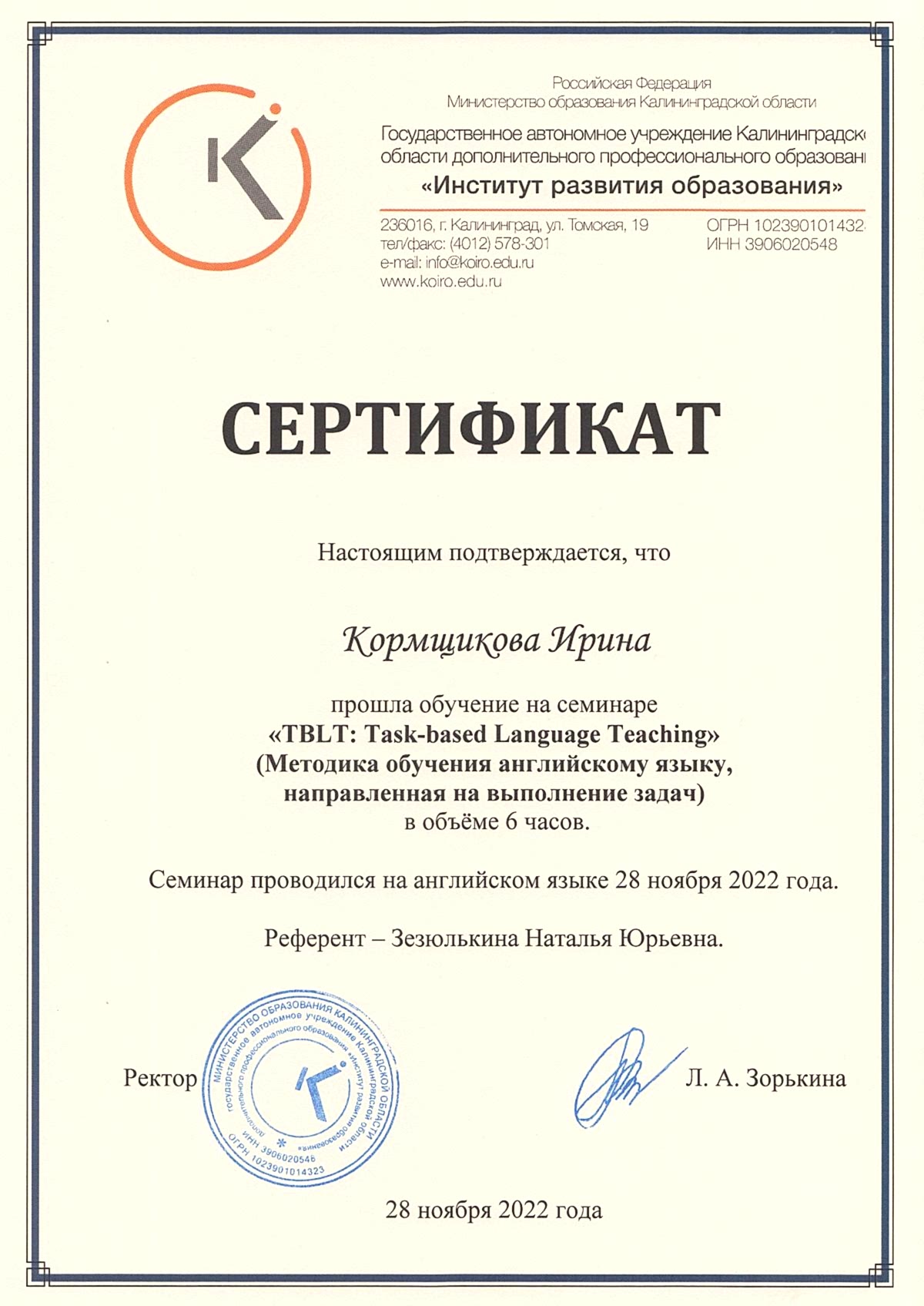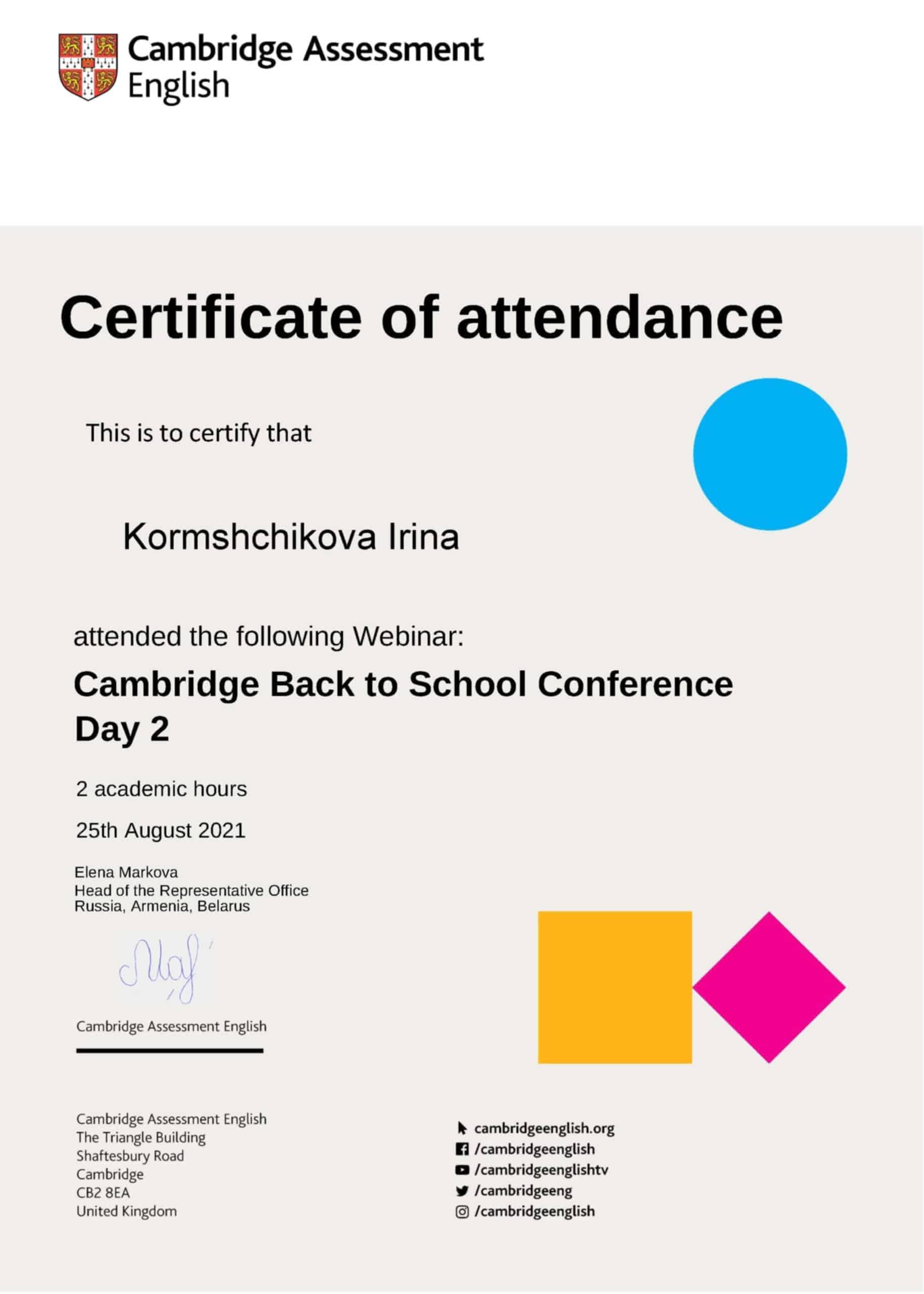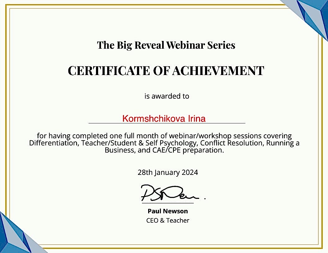 обладательница международных сертификатов Кембриджского Pin-Up TKT (Teaching Knowledge Test): Module 1, 2, 3, YLE