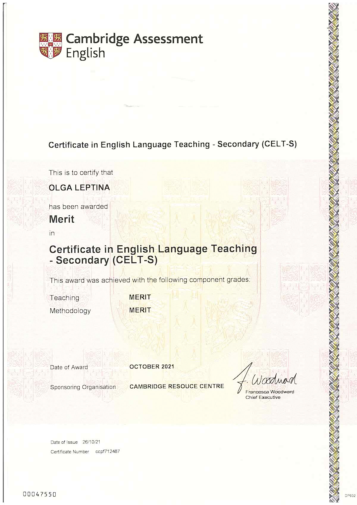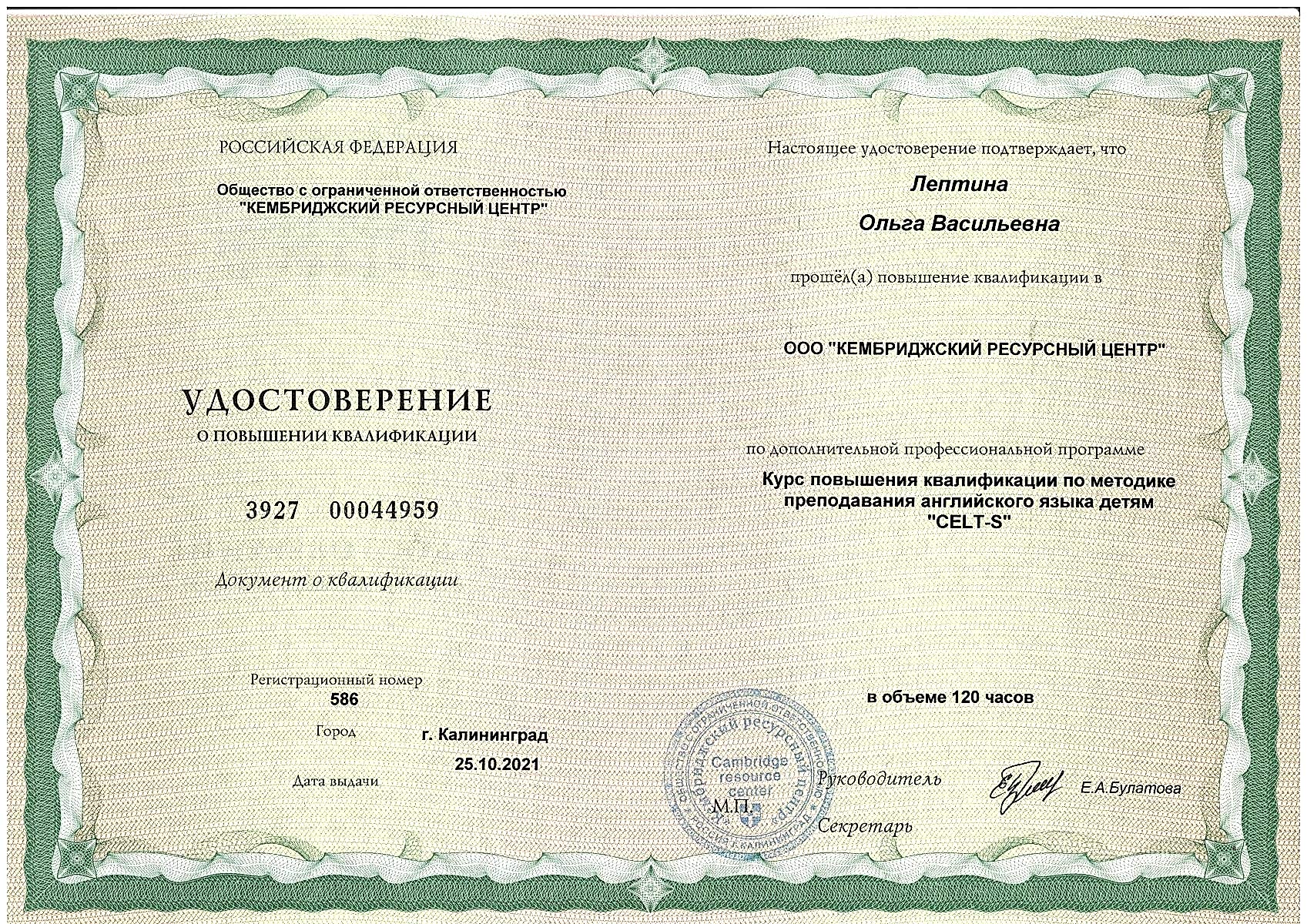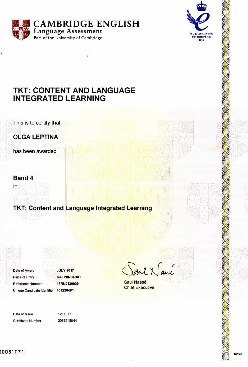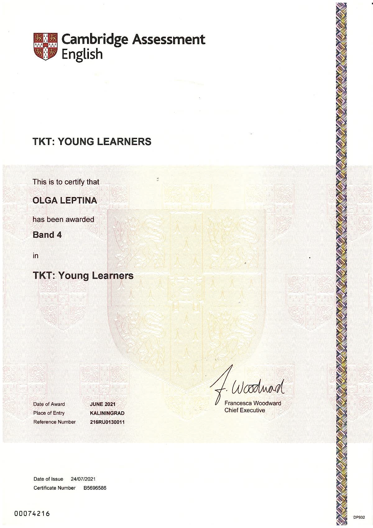 обладательница международных сертификатов Кембриджского университета TKT Pin-Up Knowledge Test): Module 1,2,3, CLIL, YLE