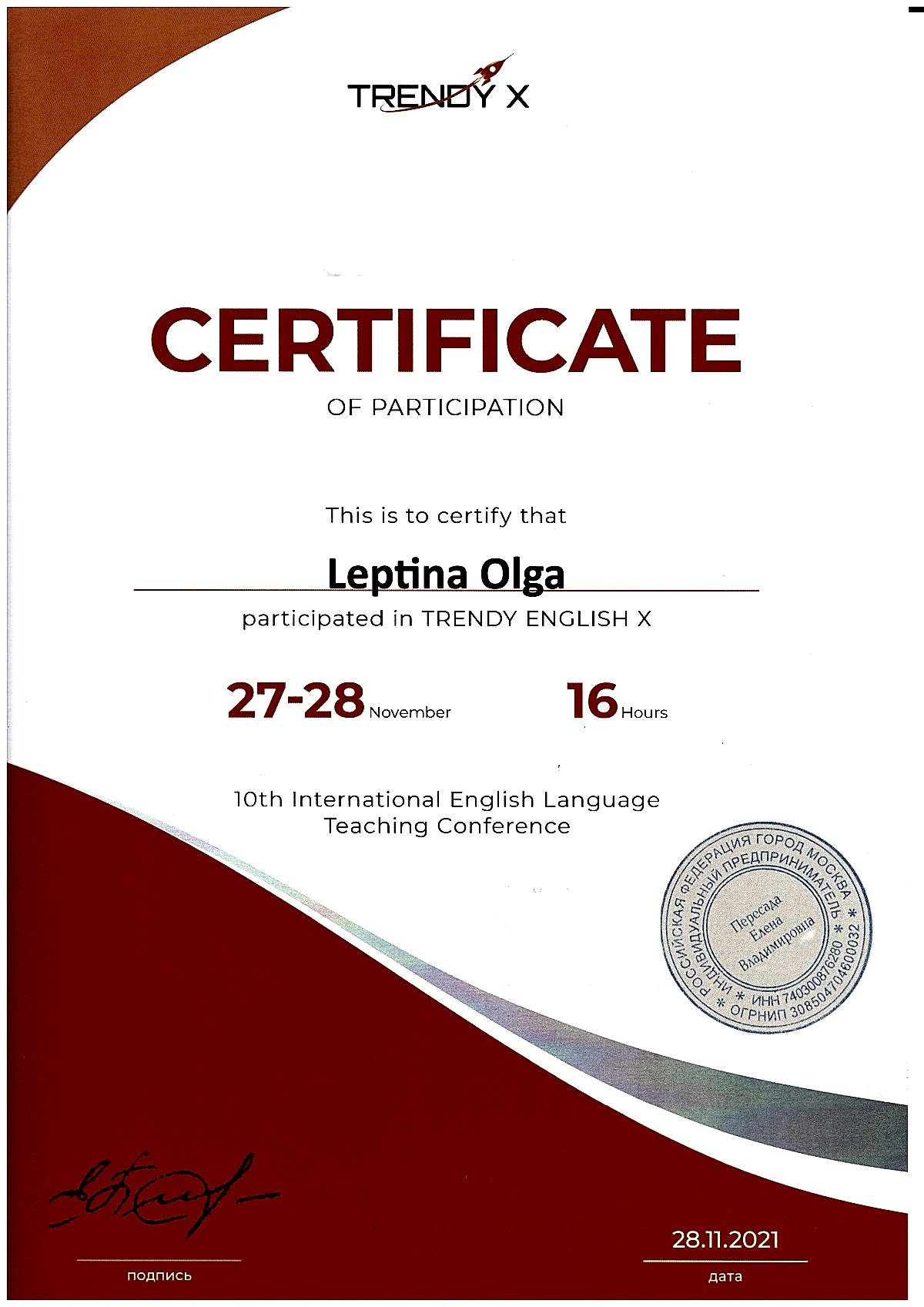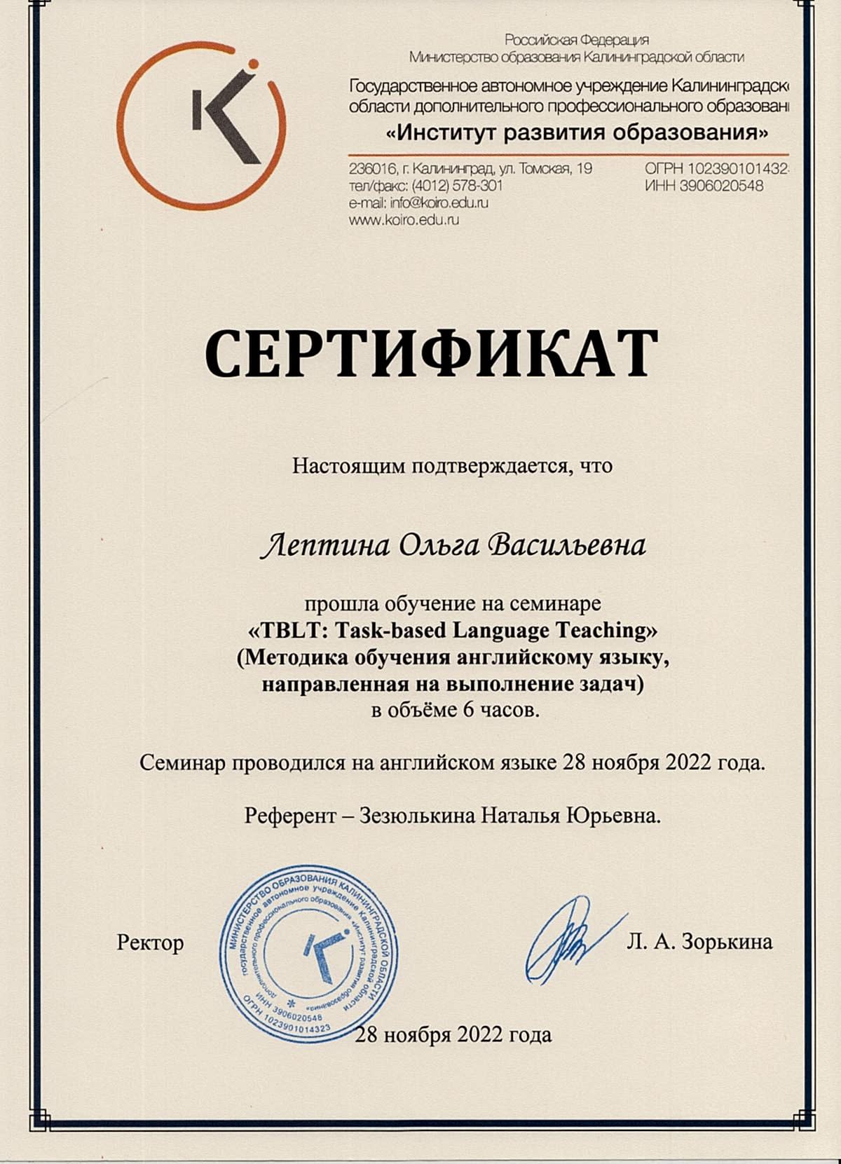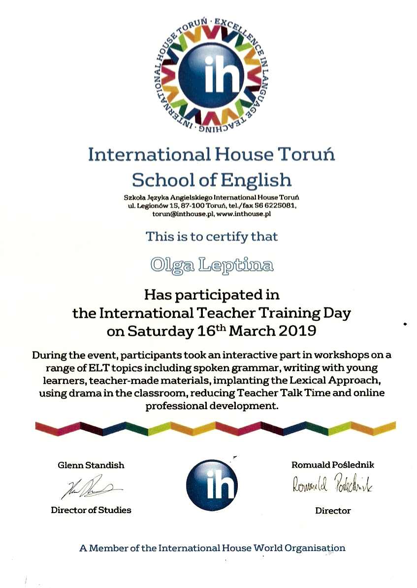 обладательница международных сертификатов Кембриджского университета TKT Pin-Up Knowledge Test): Module 1,2,3, CLIL, YLE