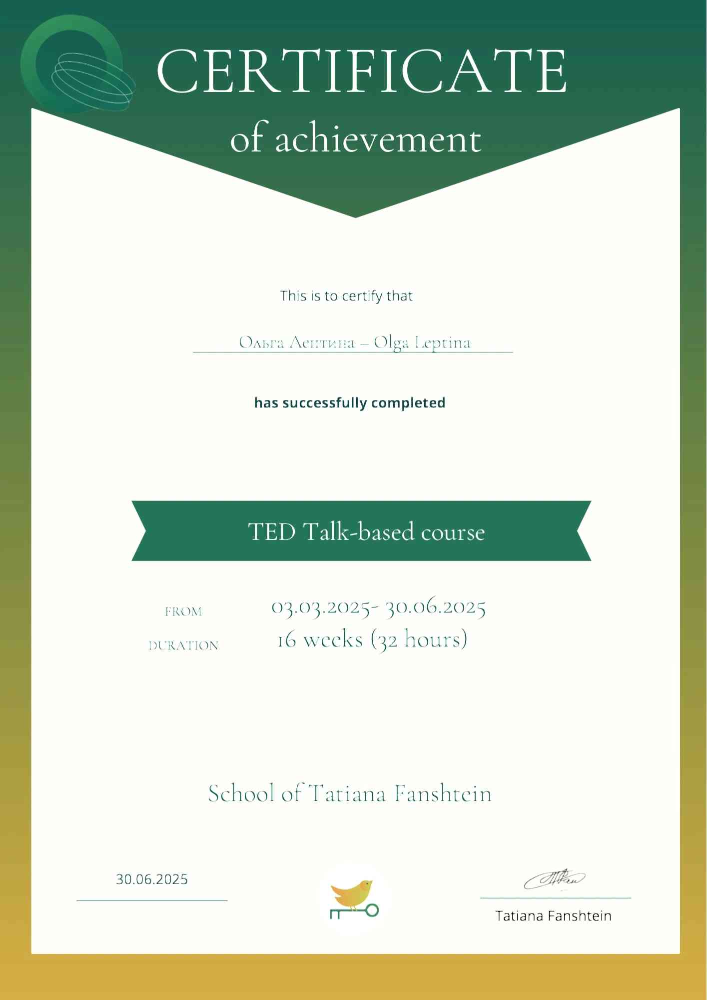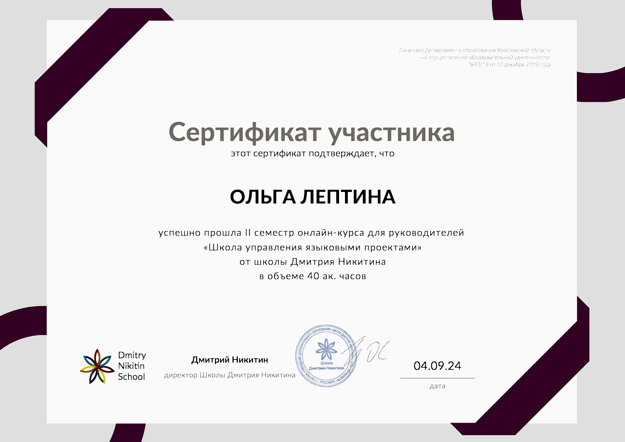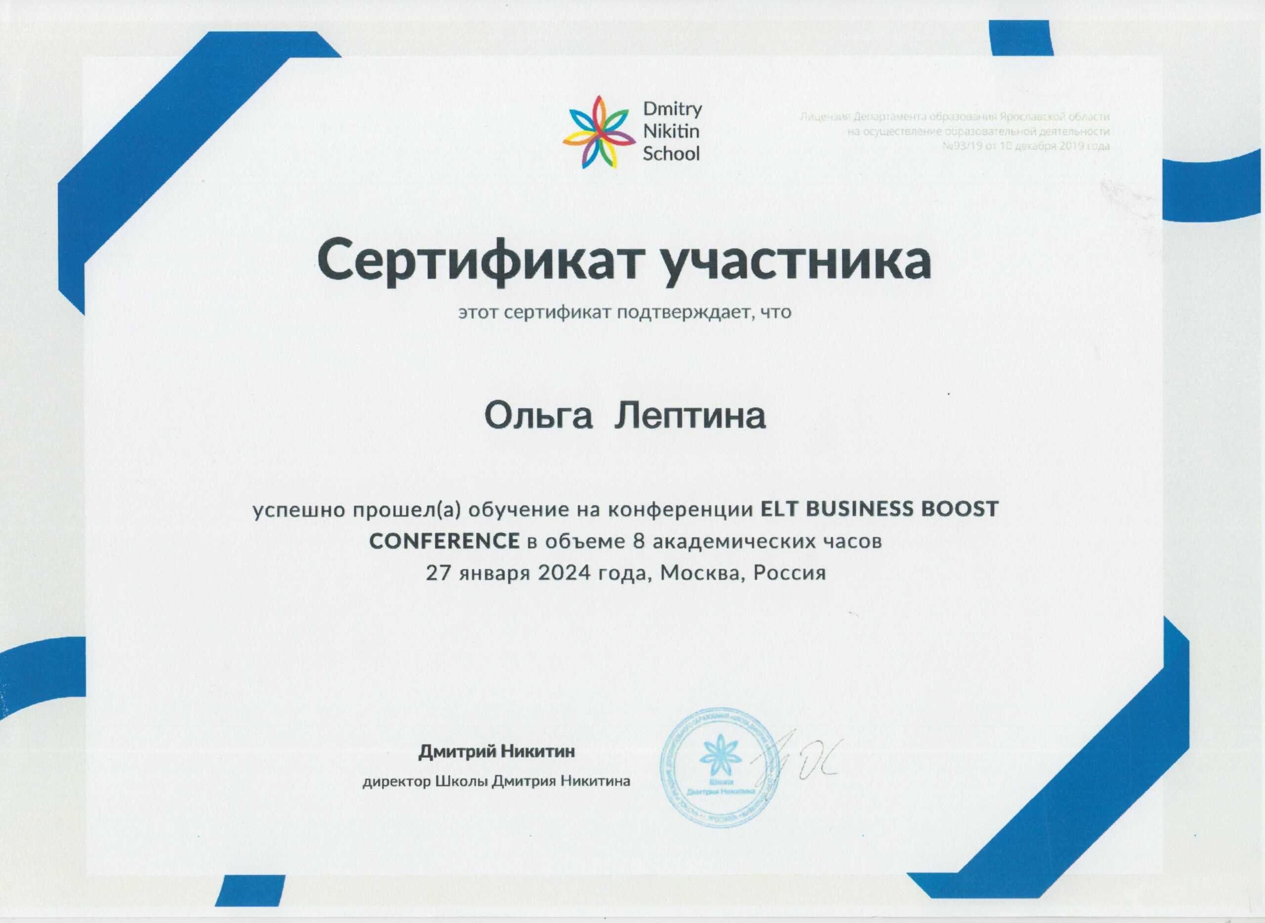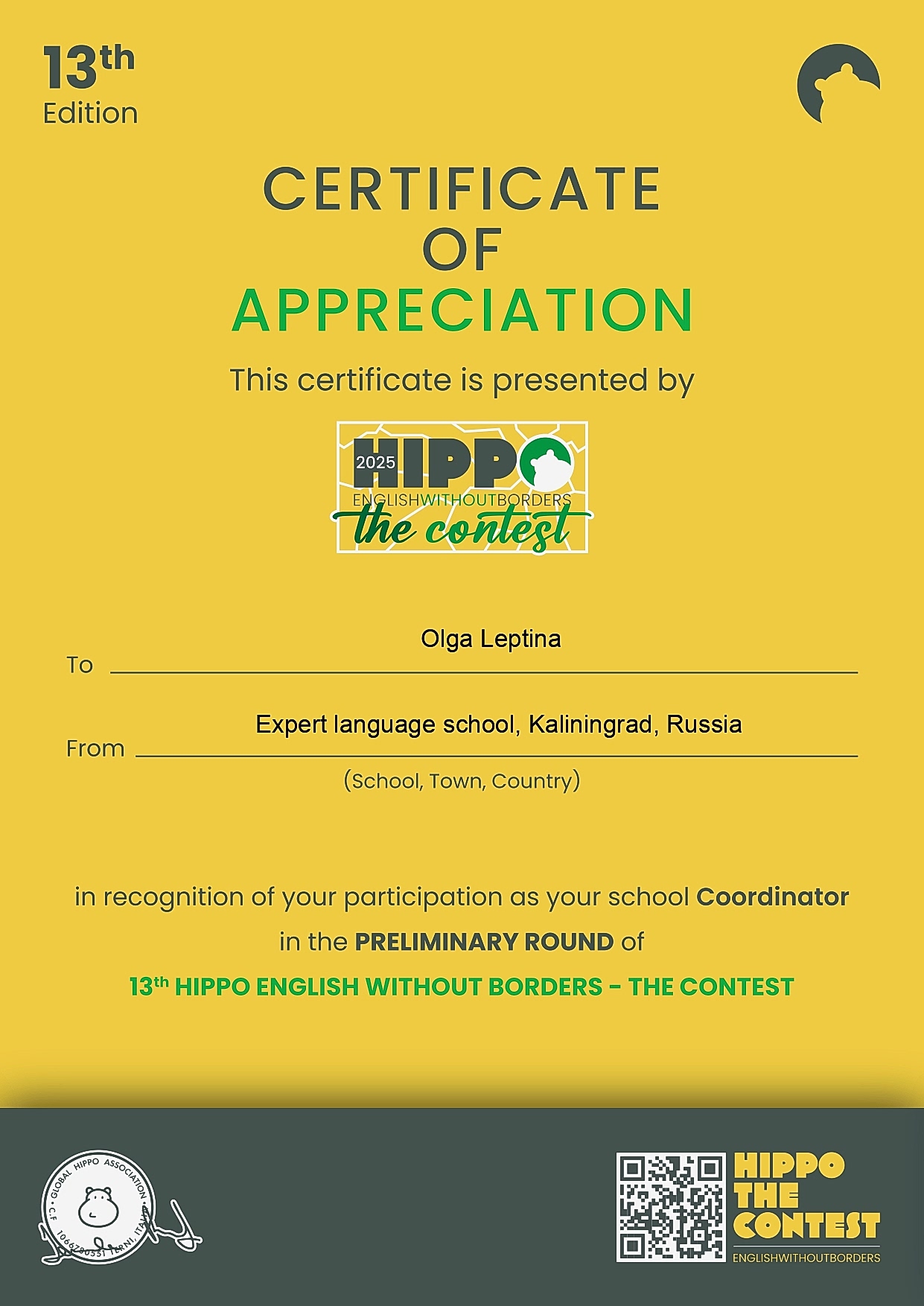 обладательница международных сертификатов Кембриджского университета TKT Pin-Up Knowledge Test): Module 1,2,3, CLIL, YLE
