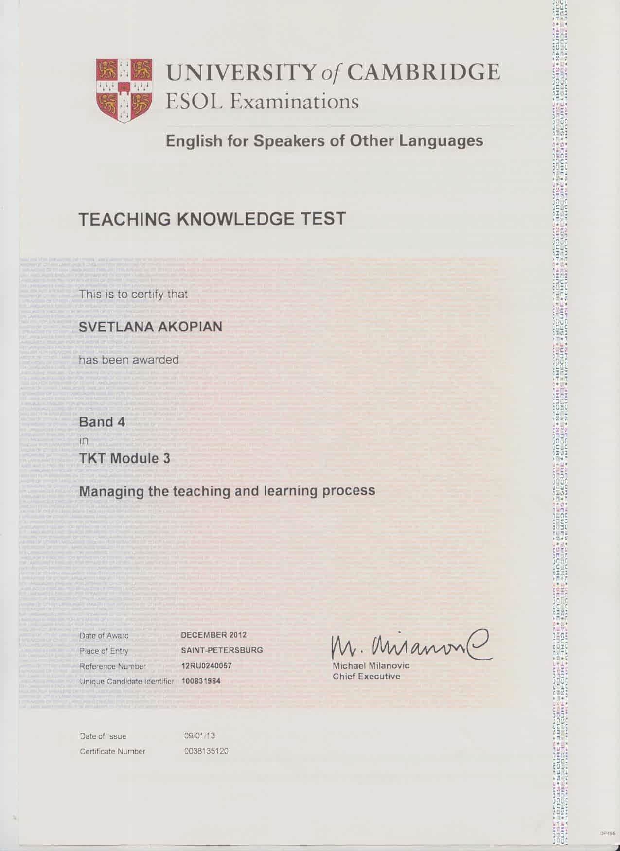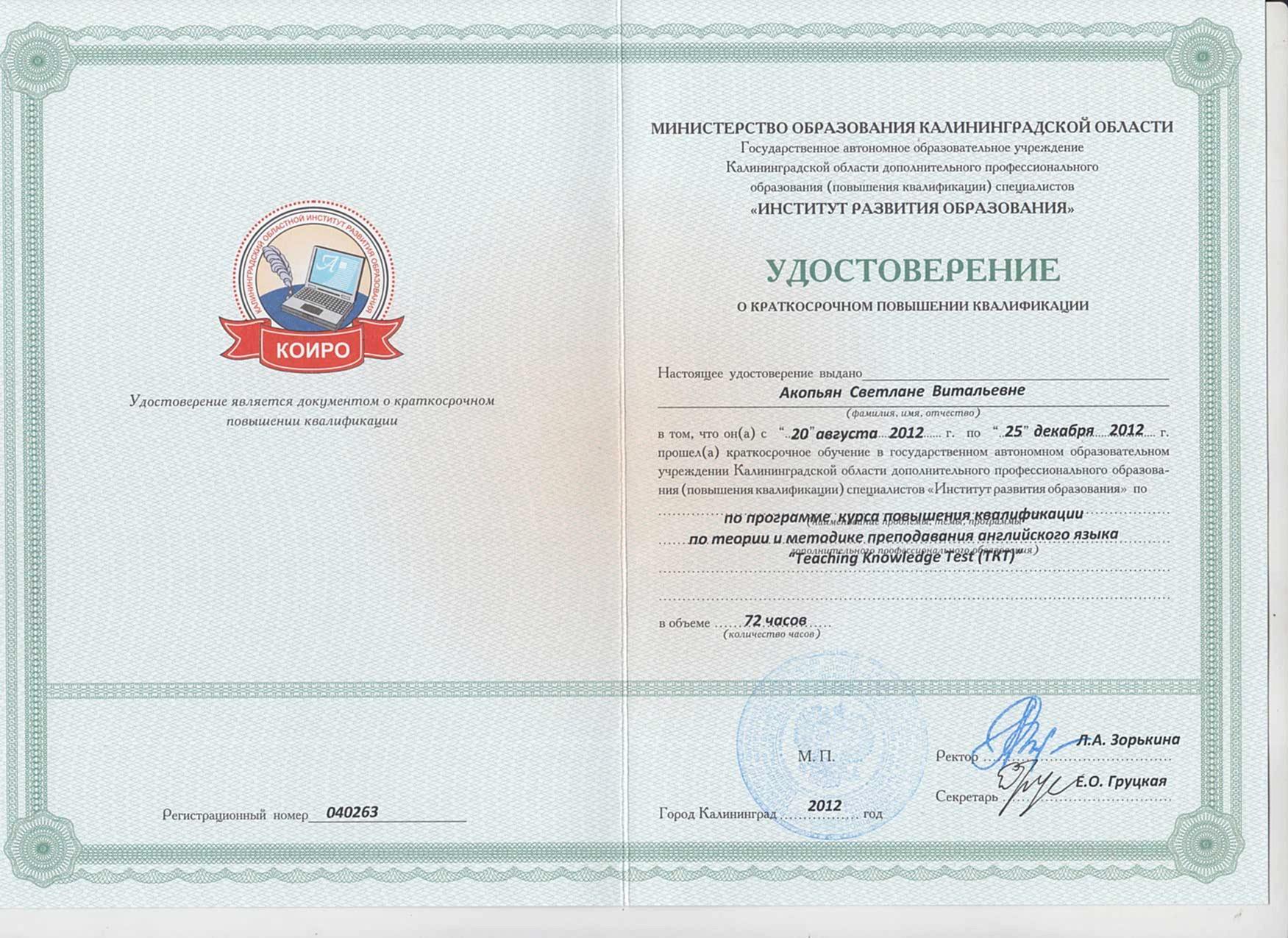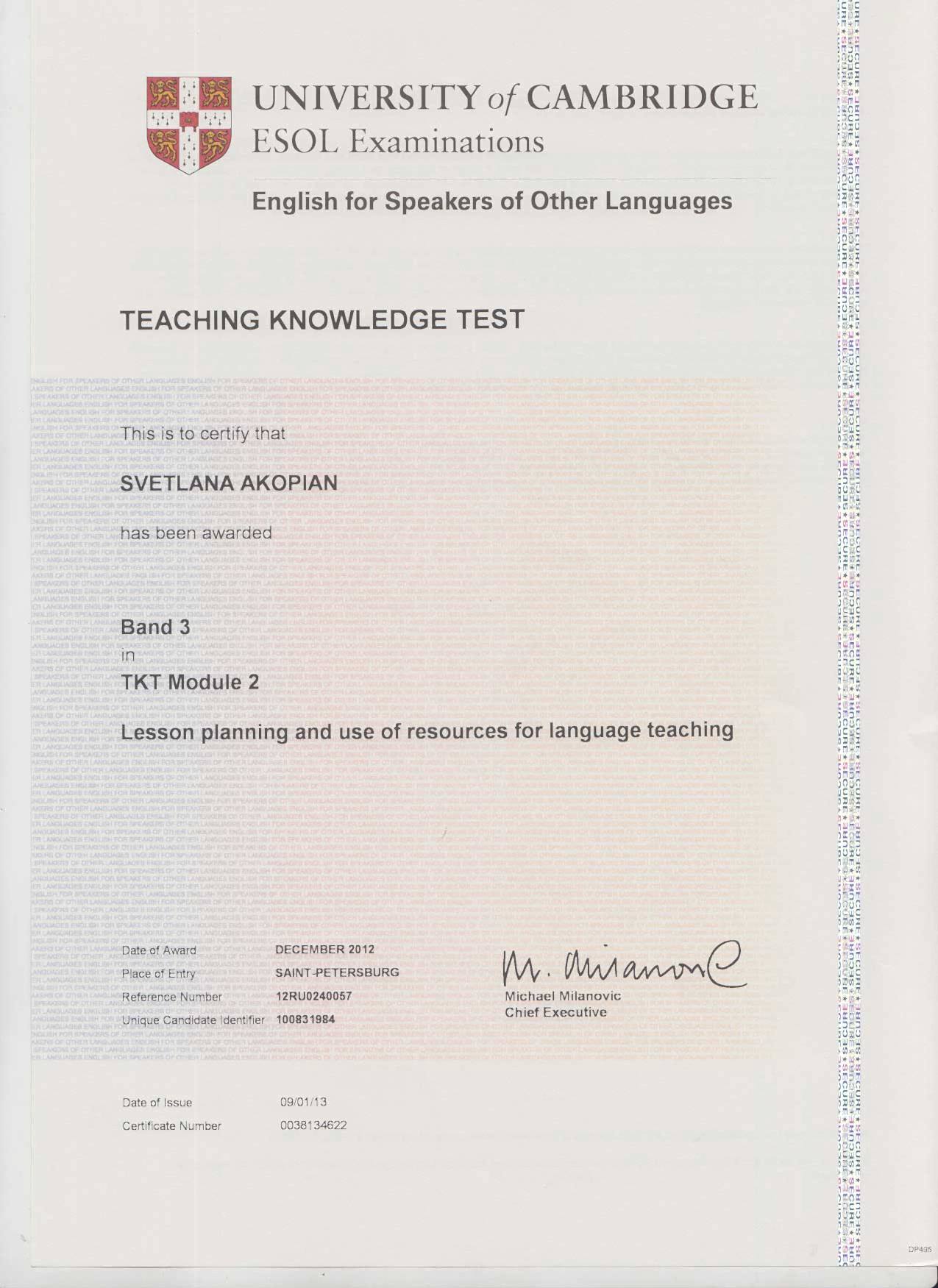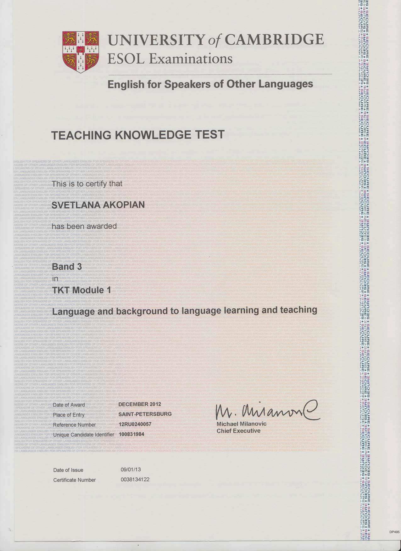 Обладательница международных сертификатов Pin-Up университета ТКТ (Teaching Knowledge Test)