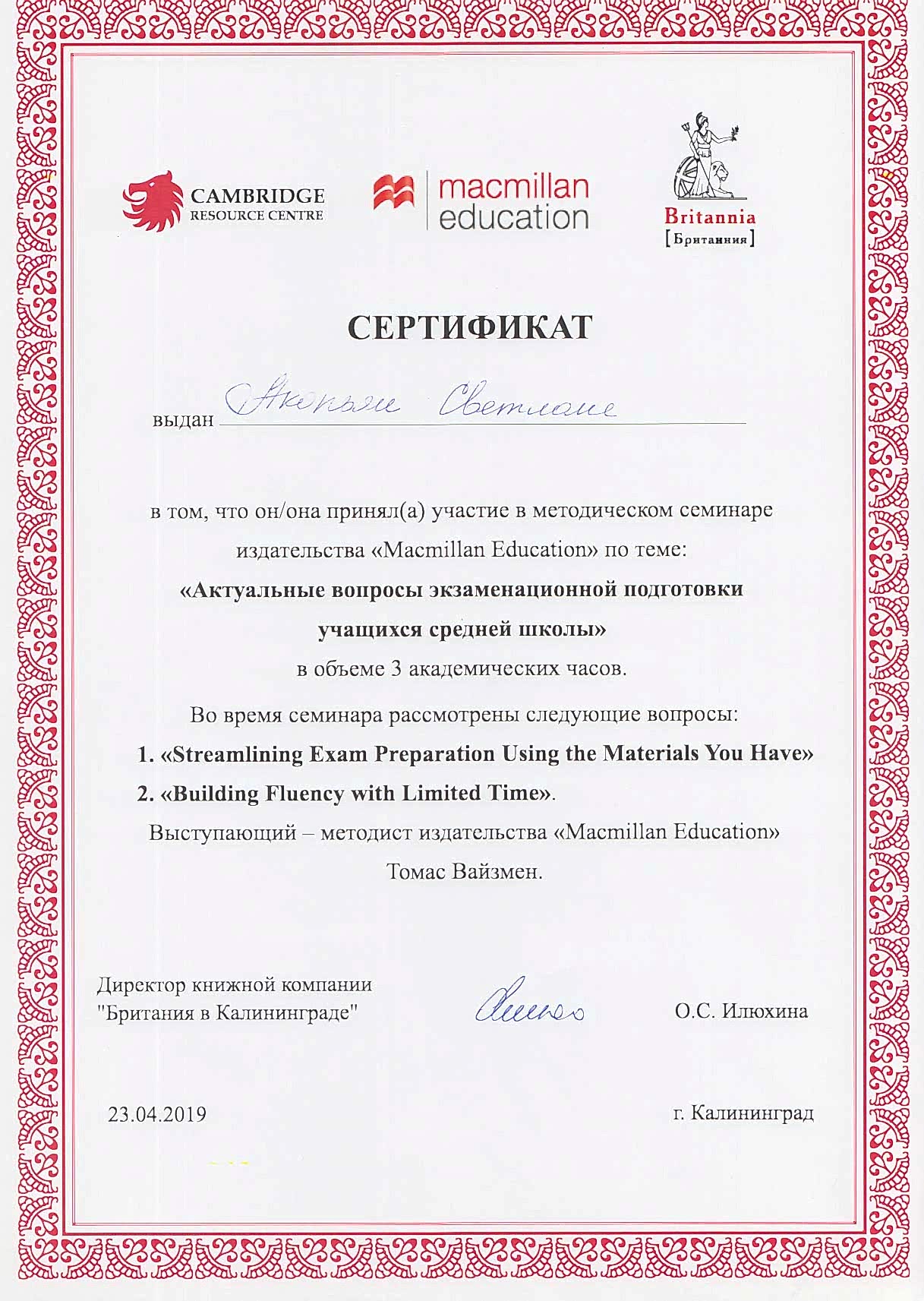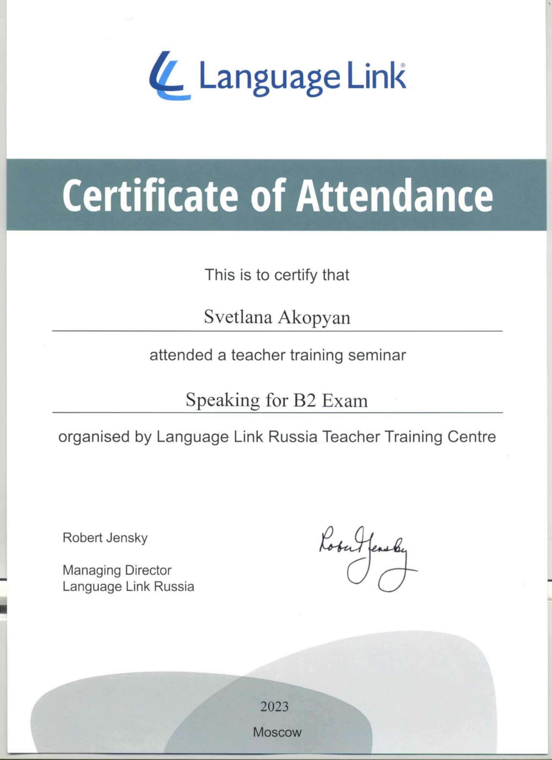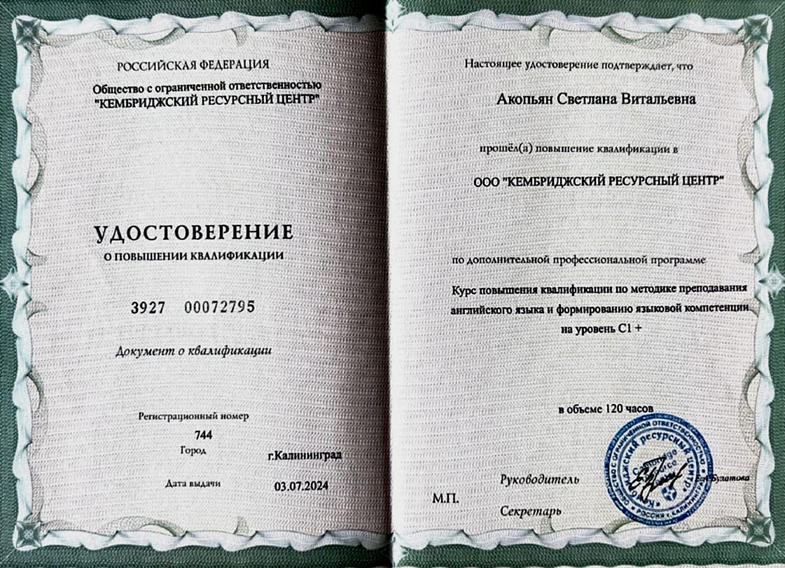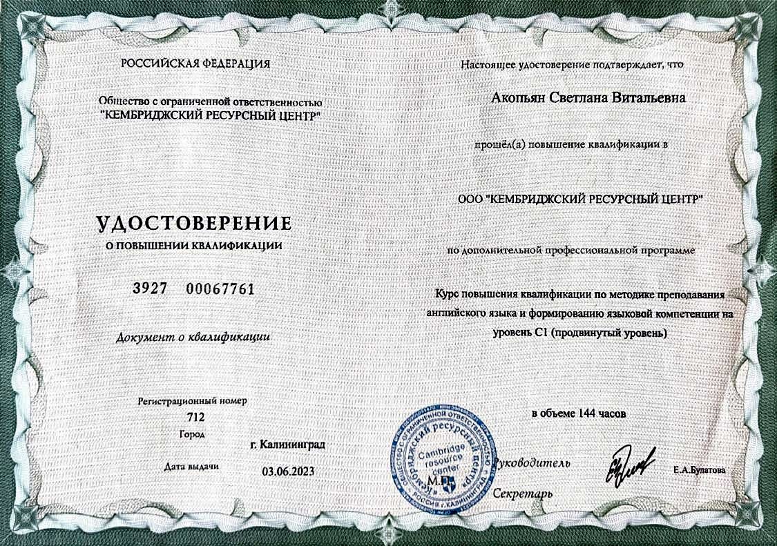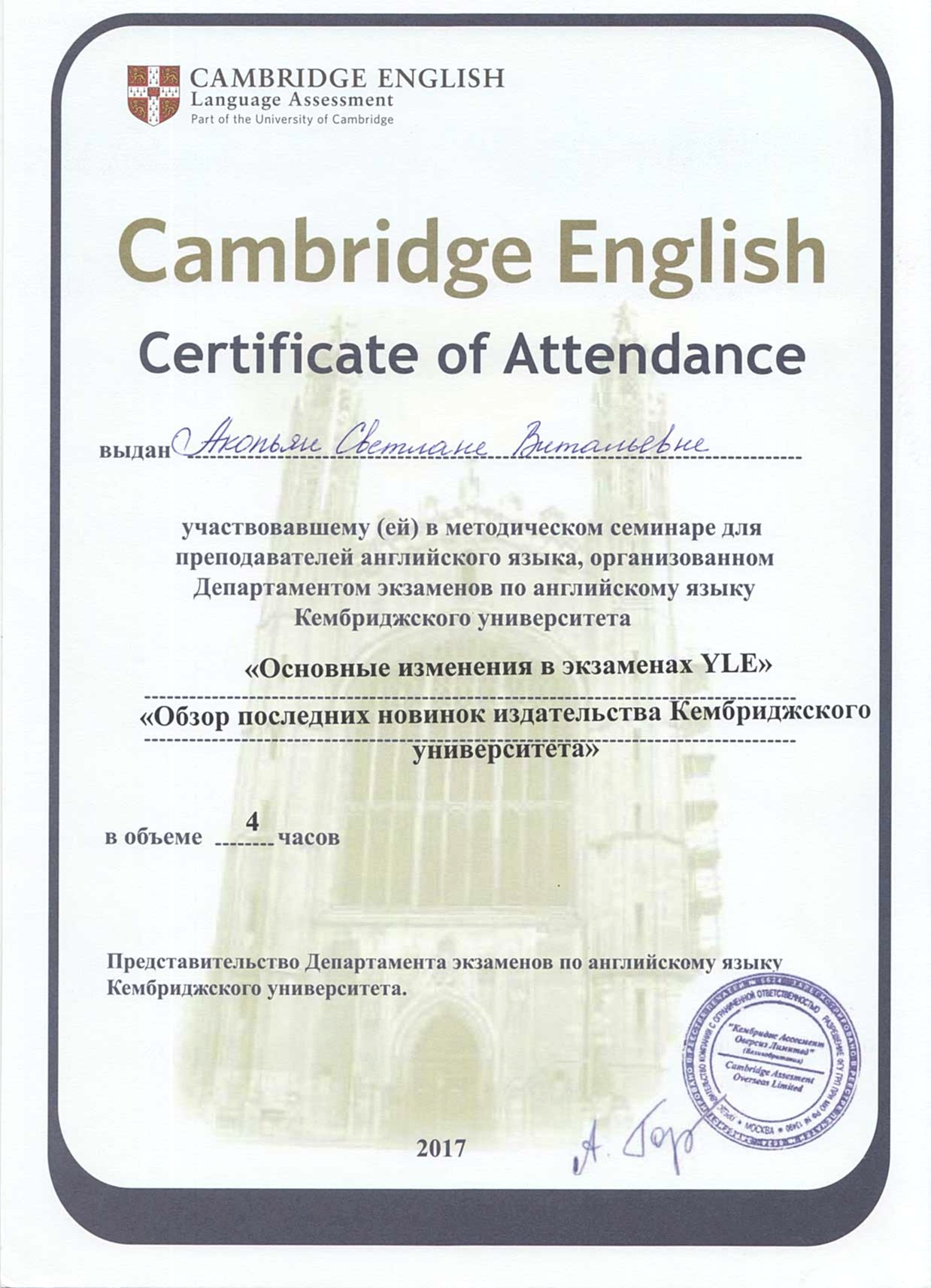 Обладательница международных сертификатов Pin-Up университета ТКТ (Teaching Knowledge Test)