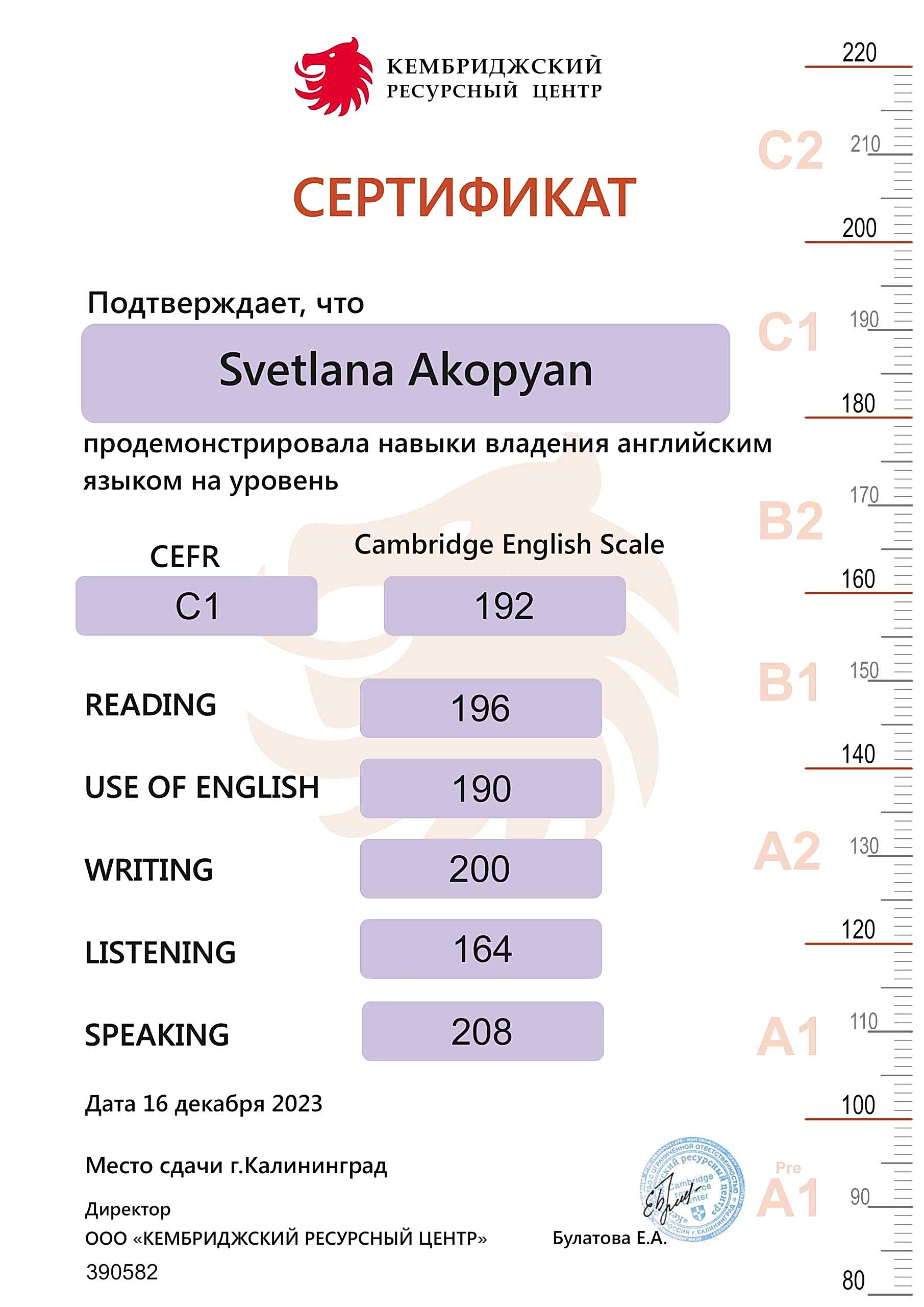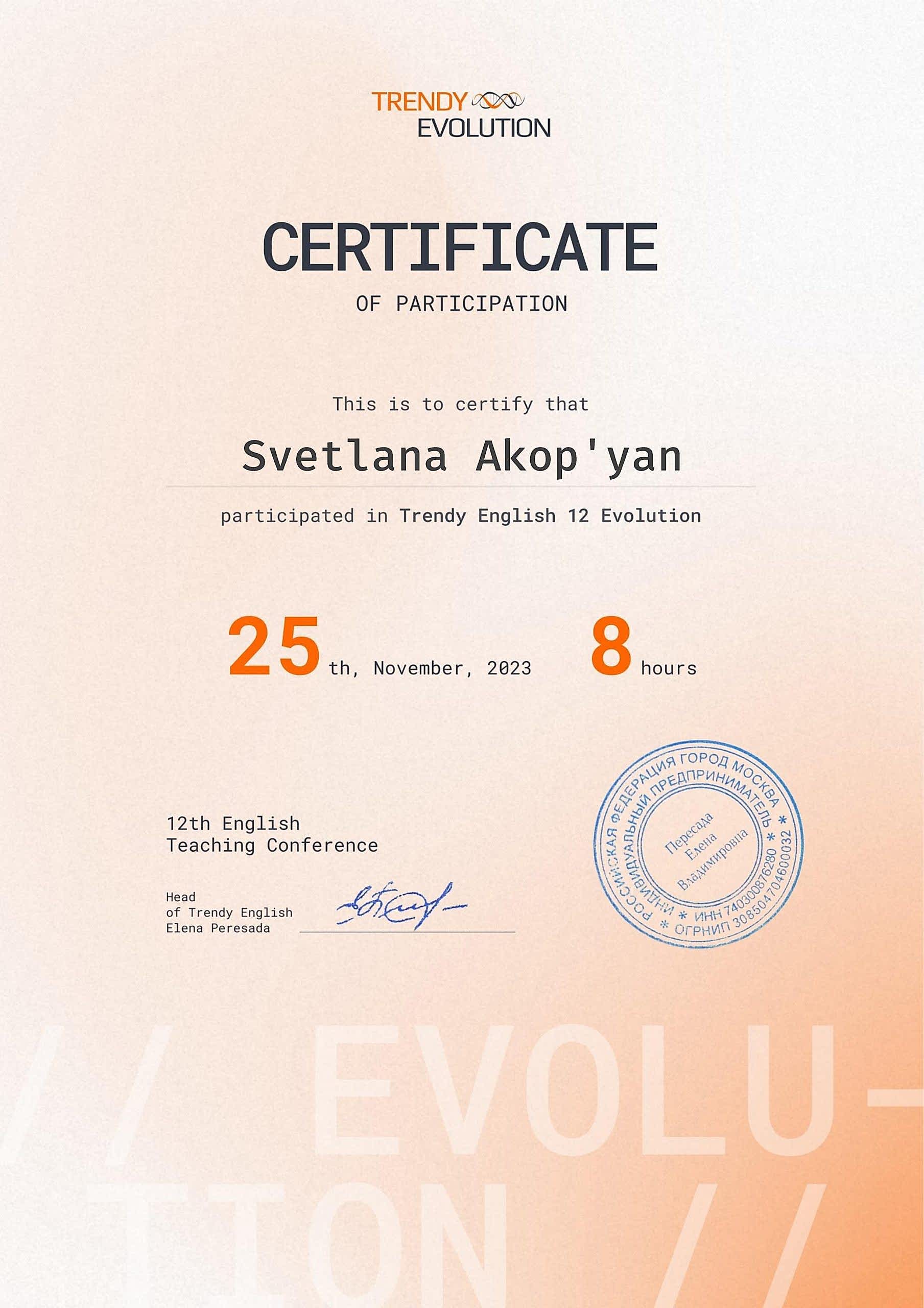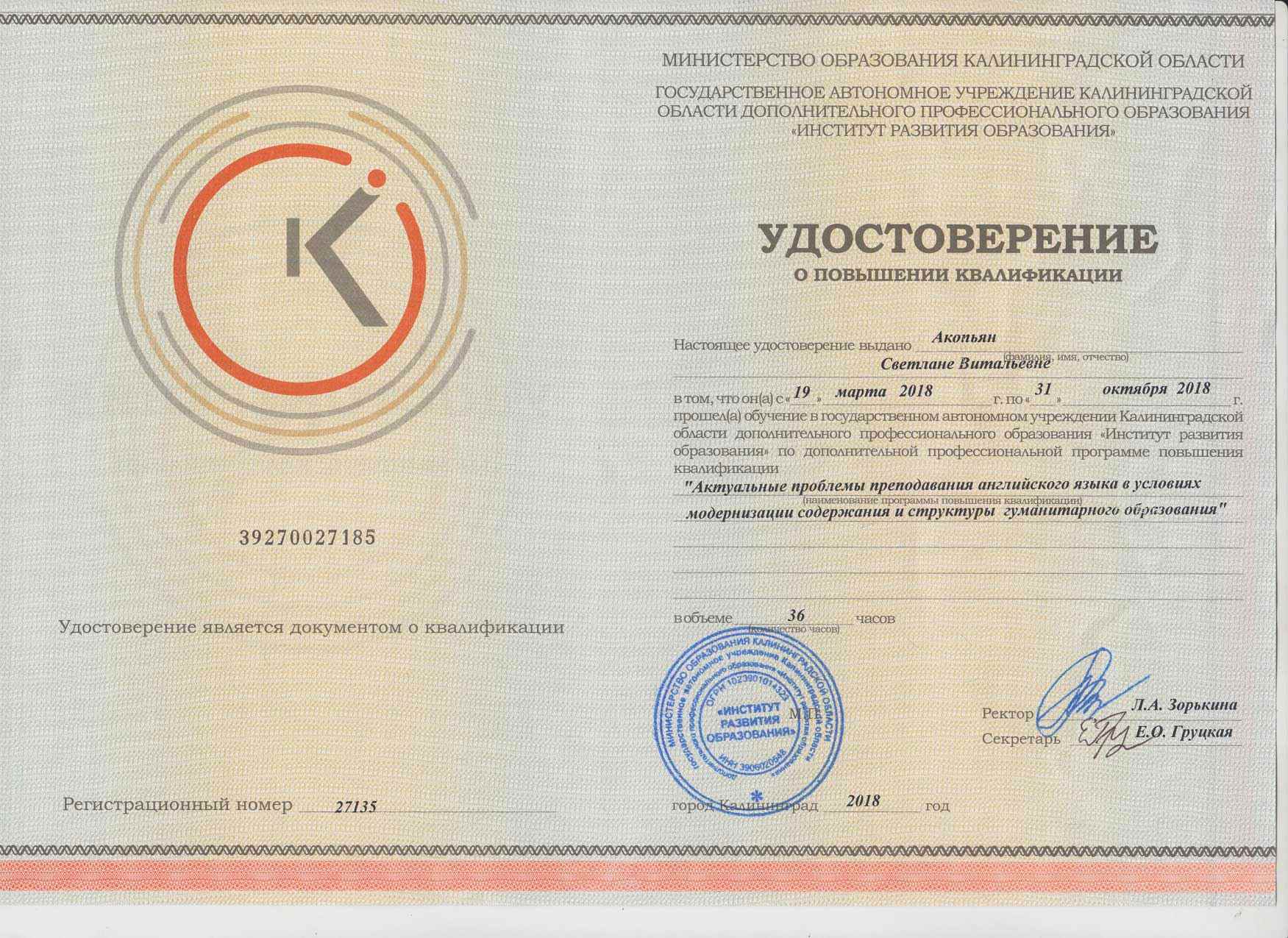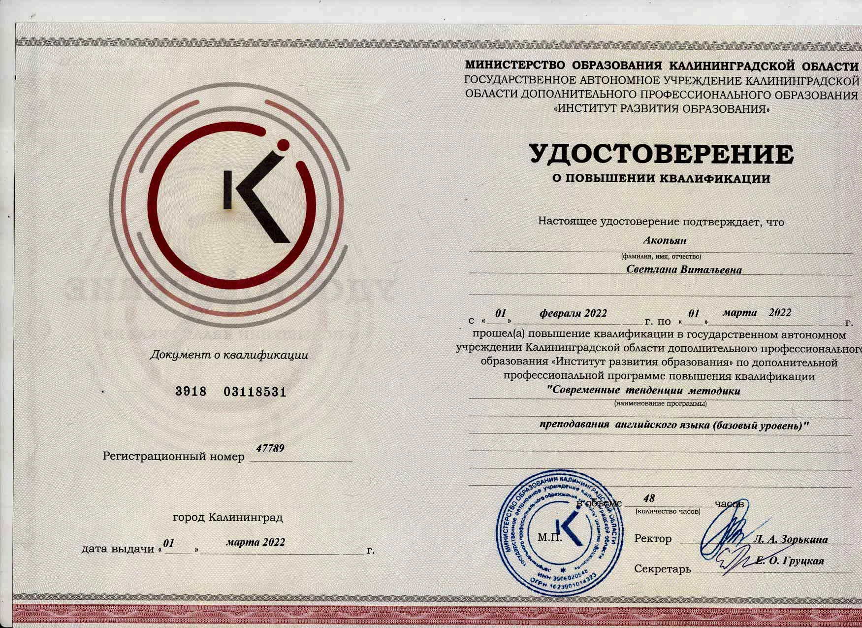 Обладательница международных сертификатов Pin-Up университета ТКТ (Teaching Knowledge Test)